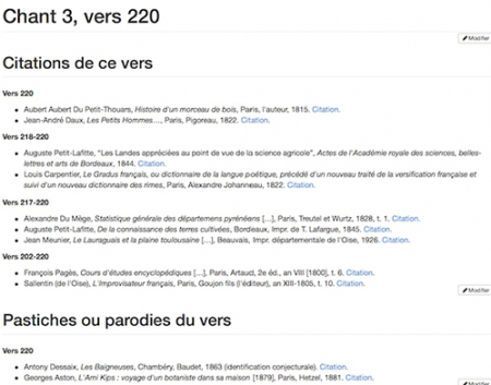 18Un second chantier, plus modeste mais permettant une analyse plus fine de l’impact d’un texte, porte sur une des sections de L’Homme des champs, constituée de 600 vers dont les reprises au sein des textes accessibles sur internet sont répertoriées et étudiées par une équipe impliquant des étudiants, au sein d’une édition en ligne que nous qualifions d’« édition inversée », puisqu’elle constitue un système de liens et d’annotation du texte principal qui n’éclaire pas ses sources, mais seulement les échos qu’il a suscités (fig. 4). De nouveau, les résultats, reversés dans la base générale, pourront faire l’objet de visualisations synthétiques.
