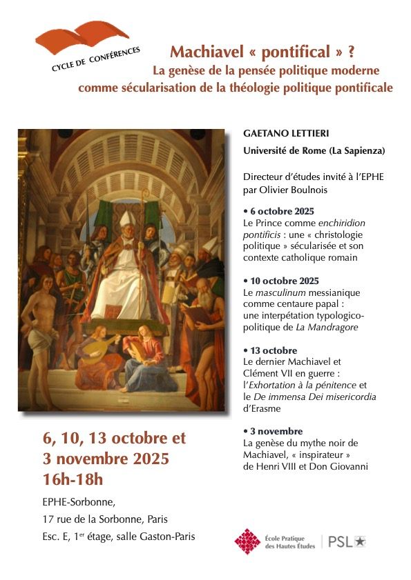 "Machiavel pontifical ? La genèse de la pensée politique moderne comme sécularisation de la théologie politique pontificale". Quatre conf. de Gaetano Lettieri (EPHE, Paris)