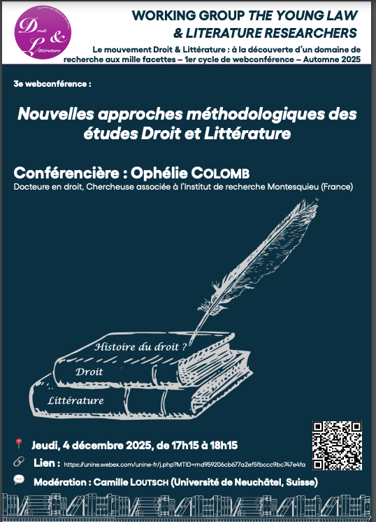 Troisième webconférence du semestre d'automne 2025 "Le mouvement Droit & Littérature : à la découverte d’un domaine de recherche aux mille facettes" du réseau international "Les jeunes chercheur-se-s en Droit & Littérature