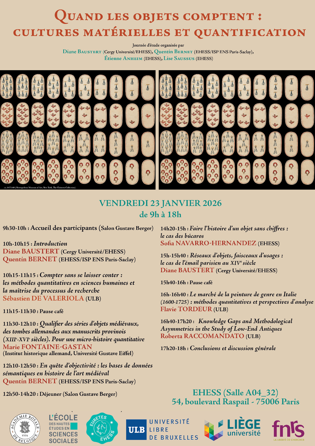 Aussi, par ces méthodes, que quantifie-t-on exactement et comment ? L’objectif de cet atelier est de réfléchir collectivement à ces questions, en présentant des études de cas relevant principalement de l’art des périodes médiévales et modernes et intégrant notamment l’évolution des questions de recherche, le développement d’outils computationnels et de grands entrepôts de données.