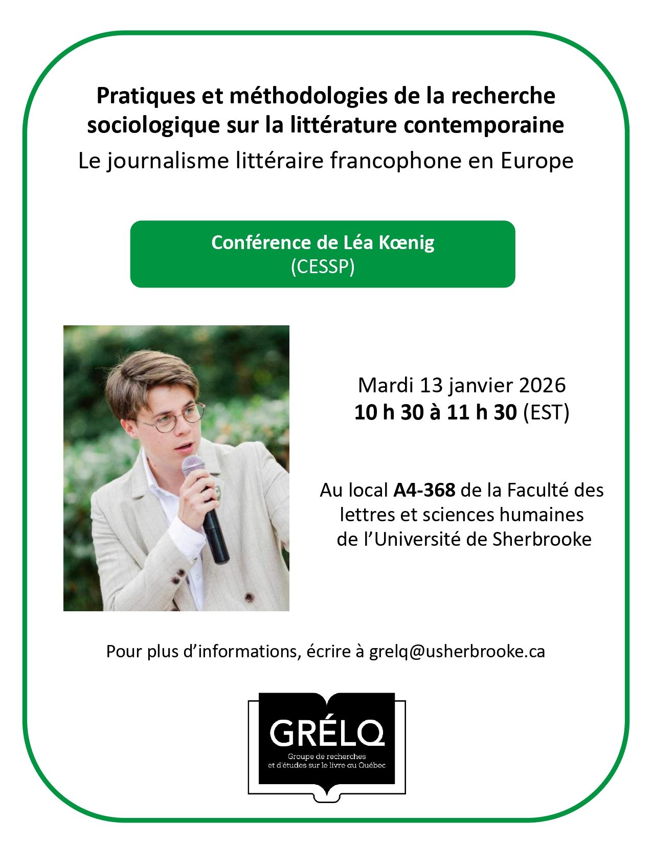 Le Groupe de recherches et d'études sur le livre au Québec (GRÉLQ) vous invite à la conférence de Léa Kœnig, qui s’intitule « Pratiques et méthodologies de la recherche sociologique sur la littérature contemporaine : le journalisme littéraire francophone en Europe », et qui aura lieu le mardi 13 janvier 2026, de 10 h 30 à 11 h 30 (EST). L’événement se déroulera exclusivement en présentiel, au local A4-368 de la Faculté des lettres et sciences humaines de l’Université de Sherbrooke.