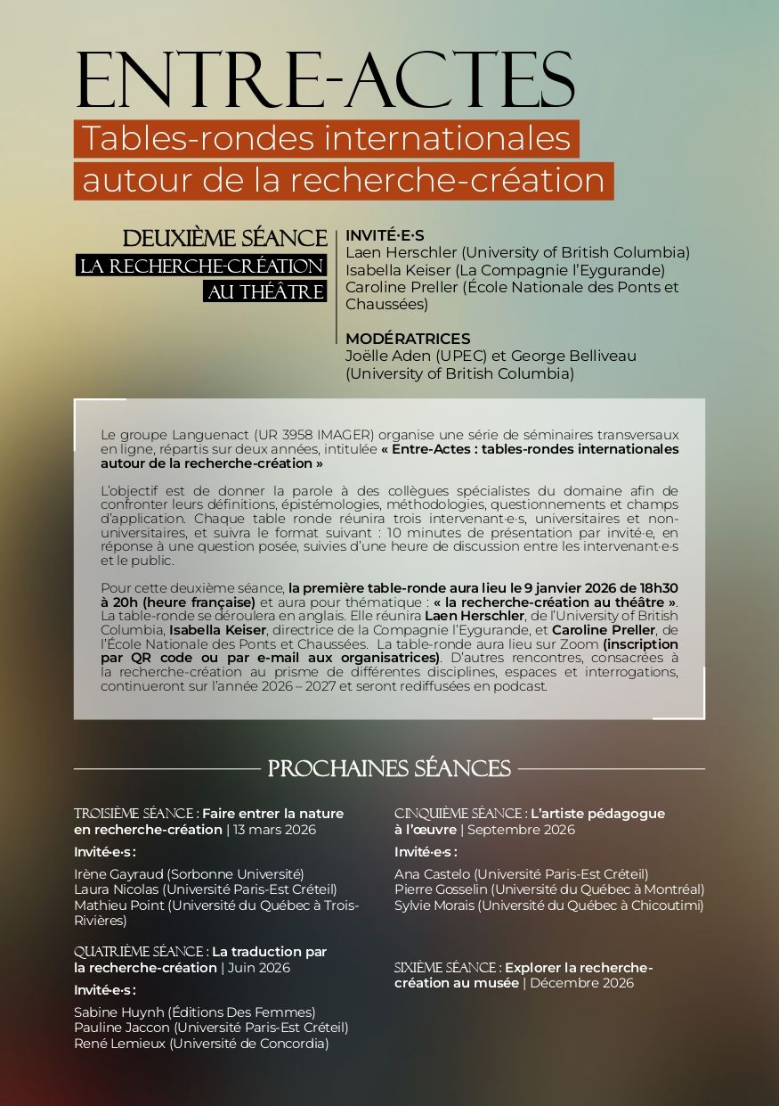 Le groupe Languenact (UR 3958 IMAGER) organise une série de séminaires transversaux en ligne, répartis sur deux années, intitulée « Entre-Actes : tables-rondes internationales autour de la recherche-création »