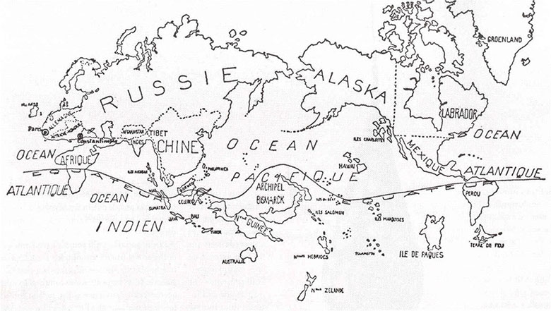 13Avec la carte « Le monde au temps des surréalistes », parue dans Variétés en 1929, le procédé est un peu différent mais l’intention est proche, puisqu’il s’agit de fondre, en une seule représentation visuelle, l’évocation primitiviste et surréaliste, auxquelles s’ajoute la faveur pour le communisme. Publiée sans signature dans un numéro devenu fameux qui fait le point sur ce qu’est le surréalisme, cette carte est d’ailleurs attribuée à Yves Tanguy (Pierre, 1980, p. 421). Elle « est à la fois l’affirmation de quelques préférences politiques et l’indication des régions ayant donné naissance à un art particulièrement admiré. La moitié du monde est ainsi réduite à rien au profit de la Nouvelle-Guinée et de l’île de Pâques » (Thirion, [1972] 1999, p. 454). Cette carte fait écho au texte de Paul Nougé paru dans la même livraison de Variétés, « Nouvelle géographie élémentaire », où il prend le contrepied des manuels scolaires et invite le lecteur à un voyage dans « ces contrées [qui] ne sont peuplées que de sauvages » (p. 16-17). À la faveur de ce numéro, la carte est aussi directement mise en relation avec le texte de Paul Éluard sur « L’Art sauvage » (p. 36-37).