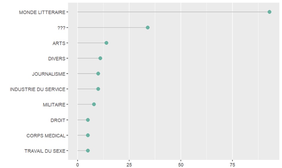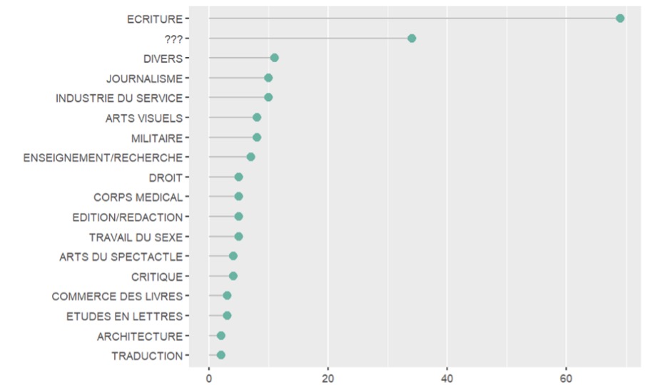 Fig. 2 : nombre de personnages nommés par métier (métiers littéraires regroupés) |