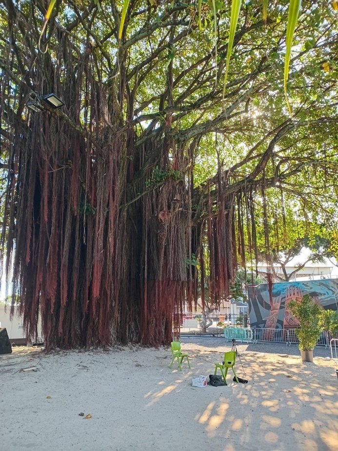 1Depuis 2011, à Tahiti, l’association Littéramā’ohi propose, gratuitement, une performance artistique unique intitulée Pīna’ina’i, écho de l’esprit et des corps. Ce rendez-vous annuel est la rencontre originale entre l’écriture, la danse et la musique. Elle réunit auteur·ices, lecteur·ices, danseur·euses, chorégraphes, musicien·nes et artisan·es, qui mettent en scène des textes, existants ou écrits pour l’occasion, d’auteur·ices océanien·nes, majoritairement tahitien·nes. C’est une aventure collective : l’association Littéramā’ohi — qui promeut déjà les cultures polynésiennes traditionnelles et contemporaines à travers une revue littéraire éponyme —travaille en partenariat avec Te Fare Tauhiti Nui-Maison de la Culture1 sur cette création qui est devenue un événement incontournable de l’agenda culturel tahitien. Cette performance qui entend faire rayonner la littérature polynésienne autochtone semble s’inscrire dans la continuité du renouveau culturel Mā’ohi 2 initié par les artistes autochtones des années 1970. Elle se déroule à Papeete, sur le paepae3 a Hiro extérieur de TFTN, surplombé d’un magistral banian.