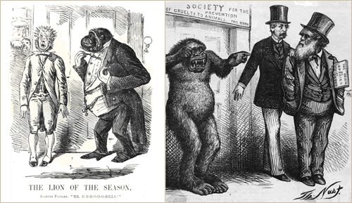 À droite : « – Le singe : “Cet homme revendique mon pedigree. Il dit qu’il est un de mes descendants.” – M. Bergh (fondateur de la Société de prévention de la cruauté contre les animaux) : “Monsieur Darwin, comment pouvez-vous l’insulter de la sorte ?” » dans Harper’s Weekly, 19 août 1871. 17