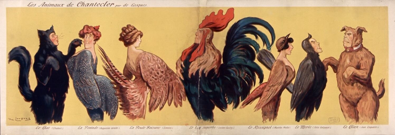 Daniel de Losques, Les Animaux de Chantecler : Le Chat (Chabert), La Pintade (Augustine Leriche), La Poule Faisane (Simone), Le Coq superbe (Lucien Guitry), Le Rossignol (Marthe Mellot), Le Merle (Félix Galipaux) et Le Chien (Jean Coquelin), lithographie en couleur, 40 x 120 cm, 1910. Image disponible sur Gallica : https://gallica.bnf.fr/ark:/12148/btv1b9005237k