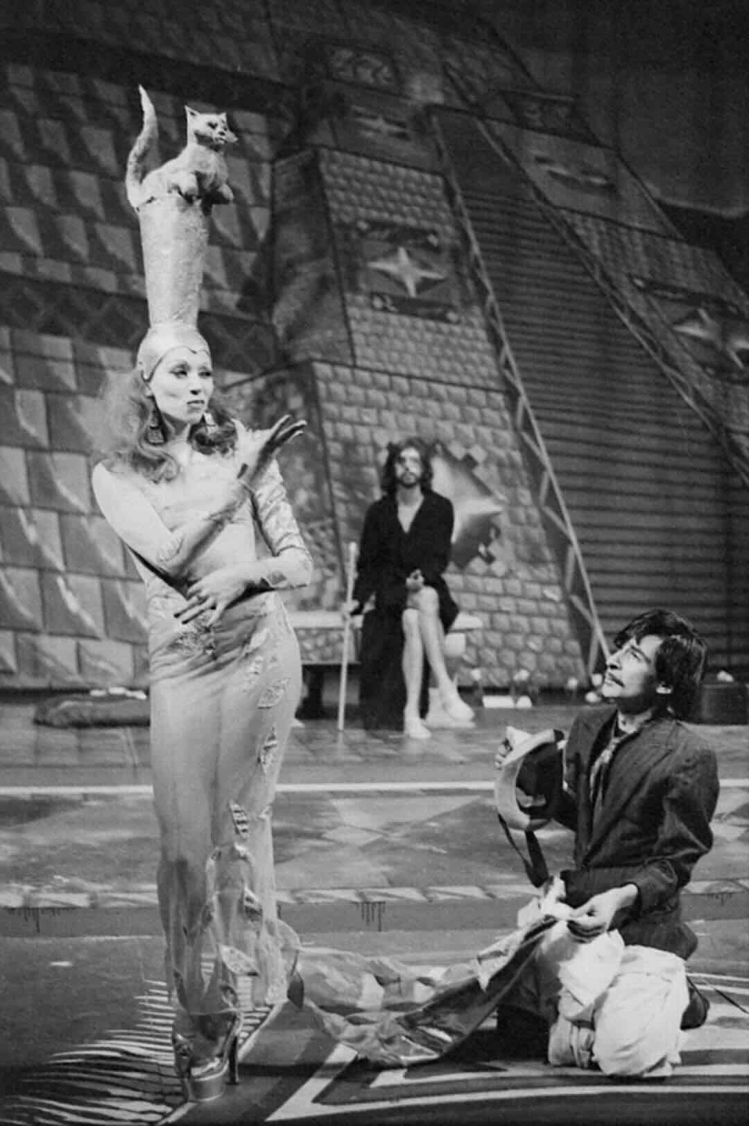 La princesse (Myriam Mézières) et un chat noir, dans La Pyramide ! de Copi, mise en scène de l’auteur, Paris, Théâtre Le Palace, 1975. Photographie : © Agence Marée-Breyer. Disponible sur Gallica : https://gallica.bnf.fr/ark:/12148/btv1b106044720/f14.item