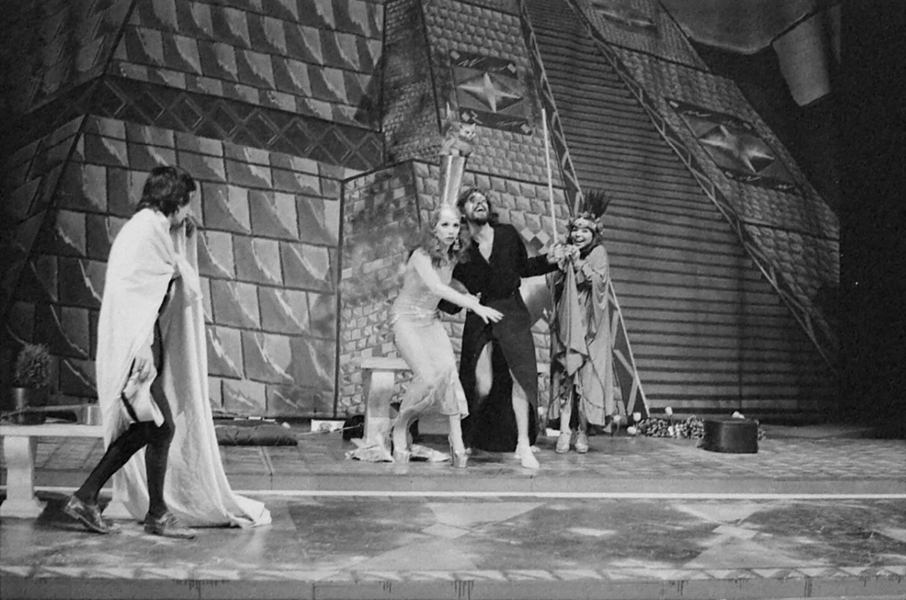 Copi (le rat), Myriam Mézières (la reine), Andrew More (le jésuite) et Hilcia d’Aubeterre (la princesse) dans La Pyramide ! de Copi, mise en scène de l’auteur, Paris, Théâtre Le Palace, 1975. Photographie : © Agence Marée-Breyer. Disponible sur Gallica : https://gallica.bnf.fr/ark:/12148/btv1b106044720/f8.item