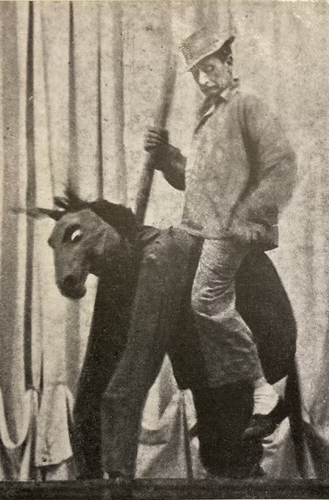 Yves Joly dans Le Meunier, son fils et l’âne, Toulouse, juin 1941. Image issue de Léon Chancerel, Les Animaux au théâtre : premier cahier, Paris, Presses de l’Île de France, 1949, p. 13.