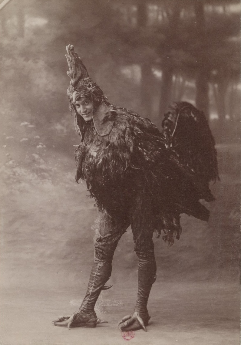 19La question s’était à vrai dire posée de choisir entre des costumes illusionnistes, entièrement animaliers, ou qui laisseraient au moins voir les visages humains des comédiennes et comédiens. L’intérêt d’Edmond Rostand pour la zoologie est établi. Son fils Jean Rostand (1963) explique que le dramaturge « avait tenu à se renseigner de la façon la plus complète sur ces volatiles qu’il avait choisis pour en faire les héros de son œuvre », qu’il « avait fait venir des Établissements Deyrolle toute une collection d’oiseaux empaillés » et qu’il « avait groupé dans un vaste poulailler toutes les races de coqs qui s’empressent au “garden party” de la pintade » (p. 34). Le dramaturge aurait poussé pour que les costumes de Chantecler soient « les plus proches visuellement des animaux qu’ils imiteront », pour « des déplacements et des attitudes les plus proches possible de la réalité » (Bulinge, [2016] 2018, p. 28). Un compromis semble avoir été trouvé entre ce souhait et les enjeux propres au théâtre : les coqs et les poules présenteraient une face humaine apparente, tandis que les hiboux et d’autres personnages secondaires se montreraient masqués ou peints17.