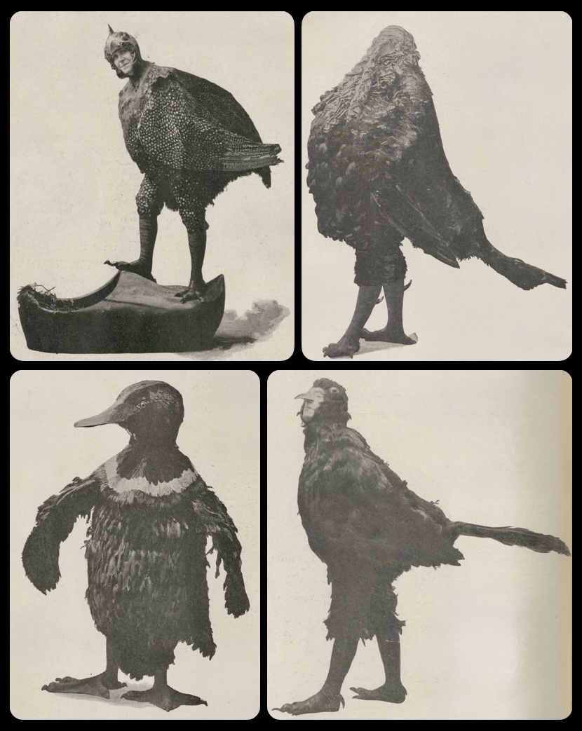 La Pintade (Augustine Leriche), Le Dindon (M. Harment), Le Canard (M. Suarez), et Le Merle (Félix Galipaux), dans Chantecler. Photographies : Bert, © Larcher. Images issues de Comœdia illustré, no 10, 19 février 1910, p. 280, 283, 275 et 276, et accessibles sur RetroNews : https://www.retronews.fr/reader/85672d37-de9a-4681-9f04-b6f0f51a6ebb/1. Toute réutilisation de ces documents doit s’inscrire dans les conditions d’abonnement prévues par le Site RetroNews.