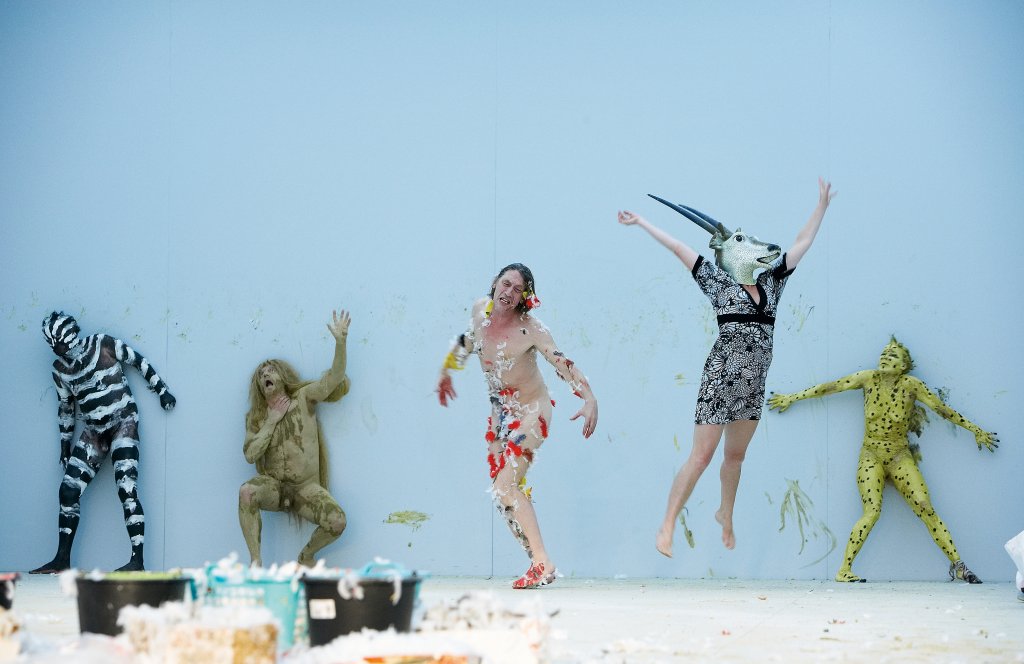 31Pour Stefan Tigges (2011), qui analyse ce spectacle en détail, les « premières séquences » de la pièce, qui montrent très longuement la manière dont les personnages se déguisent, « suscitent une expérience temporelle très subjective dont l’étendue et l’intensité extrêmes empêchent toute illusion de jeu et attirent l’attention sur les processus scéniques » ; elles signalent « une forme théâtrale ouverte qui […] refuse systématiquement le jeu dramatique41 » (p. 106 ; ma traduction)42. Si la fiction animale représentée prend corps par la suite, la scène de l’incendie, qui montre « les comédiens courir en panique à travers l’espace », est de celles où, par la simplicité des moyens utilisés, « l’illusion du jeu est brisée » et « l’attention est attirée sur la production comme sur le déploiement des situations de jeu 43 » (p. 109). Il en va de même lorsque les corps peinturlurés des personnages, « suite à des contacts avec les murs ou le sol, laissent des empreintes de couleur et perdent de la couleur », ou lorsqu’« en se touchant, les corps transpirants s’échangent des couleurs44 » (p. 110). Selon Stefan Tigges toujours :