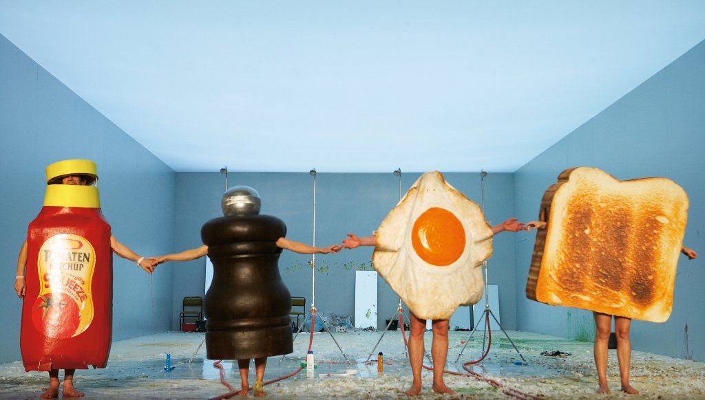 La bouteille de ketchup (Wolfgang Michael), le moulin à poivre (Kathrin Wehlisch), l’œuf au plat (Ernst Stötzner) et le toast (Dörte Lyssewski), dans Das Reich der Tiere de Roland Schimmelpfennig, mise en scène Jürgen Gosch, scénographie Johannes Schütz, Berlin, Deutsches Theater, 2007. Photographie : © Matthias Horn, avec son aimable autorisation.