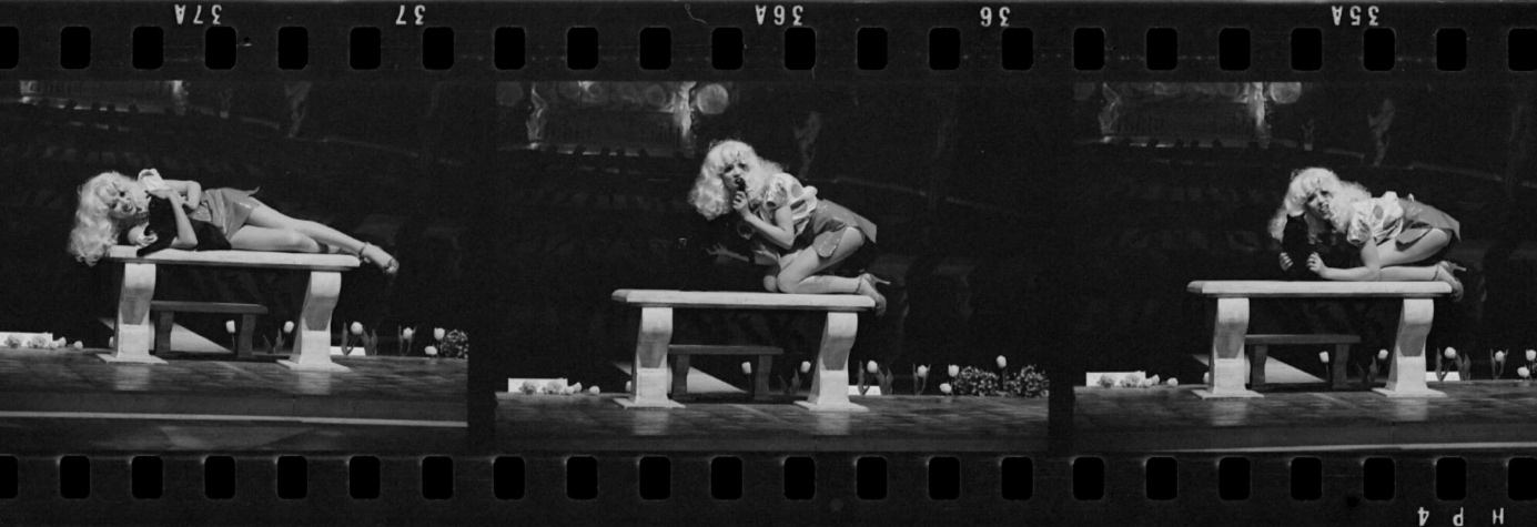 55Les indécisions fictionnelles, les surprises en cascade et l’allure d’improvisation généralisée du texte offre par ailleurs l’occasion d’investir pleinement la dimension ludique de la performance théâtrale, dans laquelle la pièce semble trouver sa logique. Comme le montre une brève vidéo disponible sur Internet63, sur scène les comédiennes et comédiens de La Pyramide ! sont énergiques, dansent, chantent. La performance de ces « acteurs en pleine forme » donne à la critique Colette Godard (1975) l’impression de les voir « flotter au hasard, sans lien, sans idée directrice » (n. p.). Si l’on a le texte en tête en regardant la vidéo, on s’aperçoit que Myriam Mézières, qui joue la princesse au premier acte, et Hilcia d’Aubeterre, qui joue la reine, s’échangent leur rôle au deuxième acte. Cette interversion est confirmée dans la presse (Godard, 1975). Elle ajoute sans doute à l’effet de contingence du représenté, qui cède au caractère ludique de la représentation. Dans la vidéo, Myriam Mézières déclare : « Les personnages des pièces de Copi sont des personnages asexués ou bisexués. Enfin, si vous voulez, un homme comme une femme peuvent les jouer » (2:51-3:00). La séquence suivante montre la vache sacrée, représentée par un comédien portant des boucles d’oreille et un haut décolleté pour femme, le dos et les jambes dénudés, en talons, et traînant derrière lui l’arrière-train, monté sur roulettes, d’une vache en carton ou papier mâché.