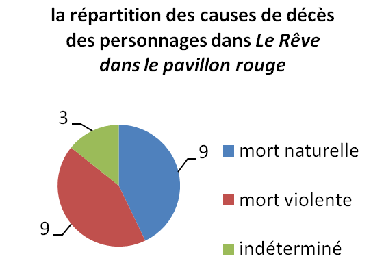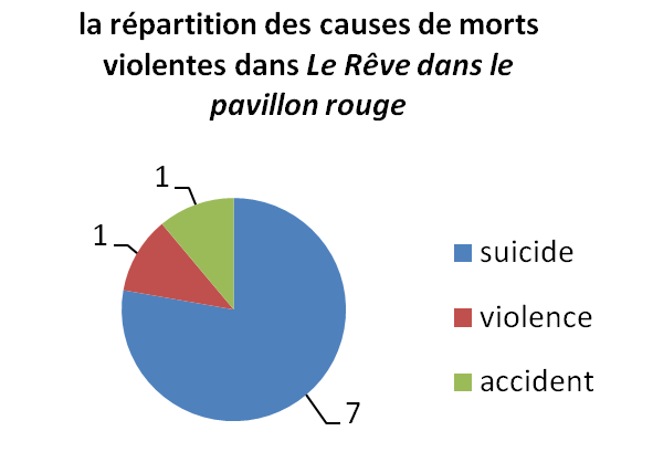37Le taux de mortalité par mort violente est assez élevé dans les deux romans : 59,5% dans L’Astrée, et 43% dans Le Rêve dans le pavillon rouge. Toutefois, il ne s’agit pas des mêmes sortes de morts : Dans L’Astrée, c’est le combat qui cause le plus de morts violentes, tandis que dans Le Rêve dans le pavillon rouge, c’est le suicide. Cette différence considérable de taux de suicide entre les deux œuvres est aussi un point très intéressant qui, dans une certaine mesure, peut caractériser les styles démographiques des deux écrivains.