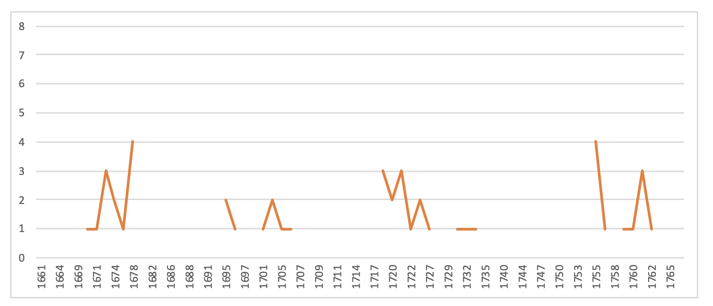 9Jusqu’à un certain point, la même observation peut être faite au sujet de l’évolution du nombre de personnages dans le temps, ou de la présence accrue ou plus modeste de personnages féminins : dans les deux cas, les graphiques donnent à voir des fluctuations cycliques, avec des pics à certaines périodes (par exemple 1671-1886, puis 1735, pour ce qui est du nombre de femmes), puis des périodes de plus grande frugalité en la matière.