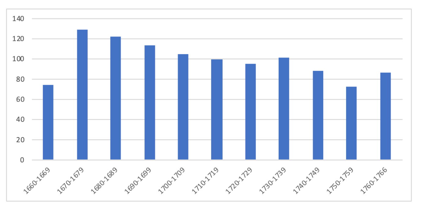 10En y regardant de plus près, on peut lire une certaine corrélation avec l’évolution de la comédie telle que décrite par les histoires littéraires. Ainsi, la comédie de mœurs qui fleurit de 1680 à 170011 a besoin d’un personnel dramatique plus étoffé, car elle se propose de peindre les travers de la société contemporaine, ce qui paraît se refléter dans les valeurs plus élevées qu’on enregistre par décade à gauche du graphique (exception faite de la période 1660-1669) :