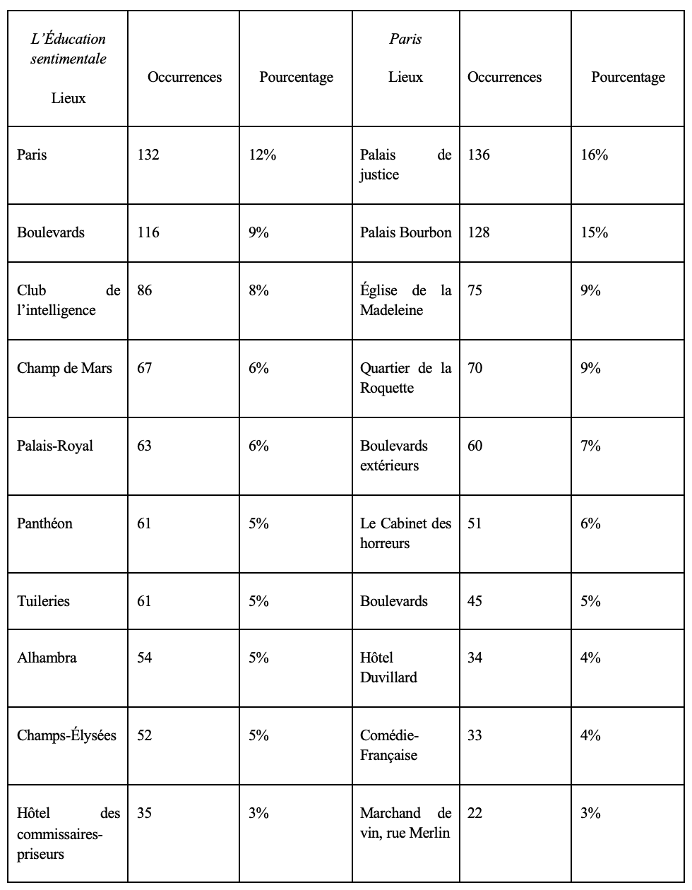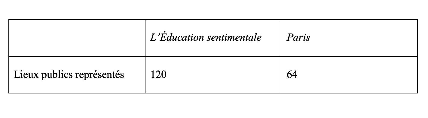 1238% des figurants apparaissent dans des espaces publics parisiens dans L’Éducation sentimentale6. Pour Paris, cela représente 36% des occurrences7. On constate alors la place importante des lieux publics parisiens dans ces deux romans, avec une prédominance dans L’Éducation sentimentale, ce qui en fait donc un terrain propice à l’étude de cette population fictionnelle.