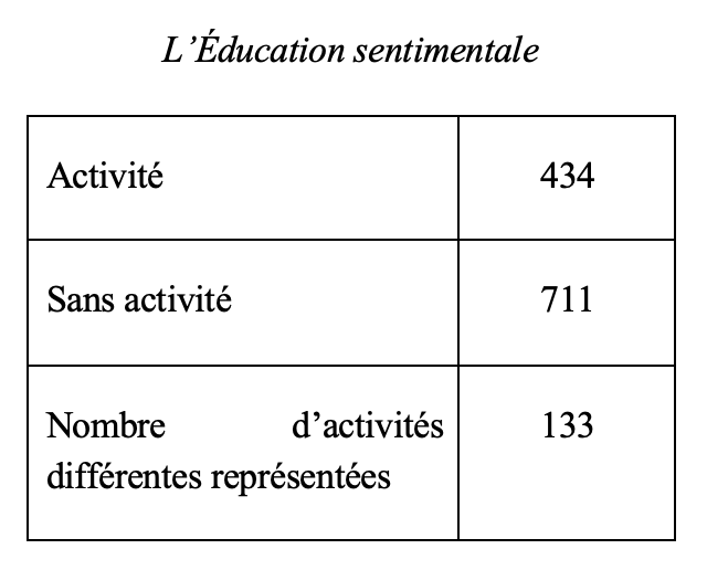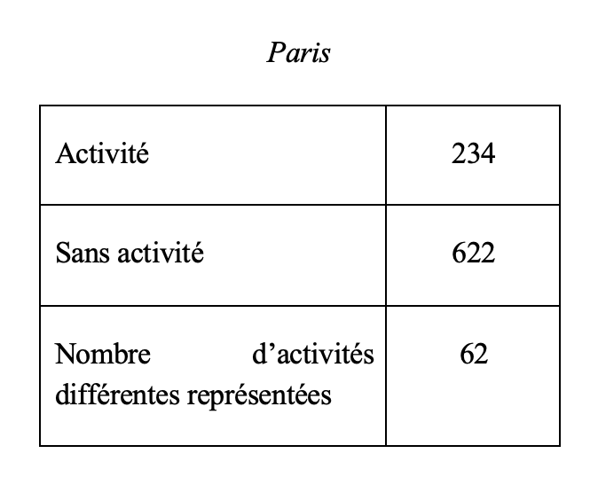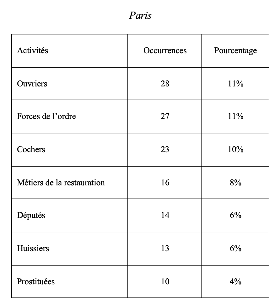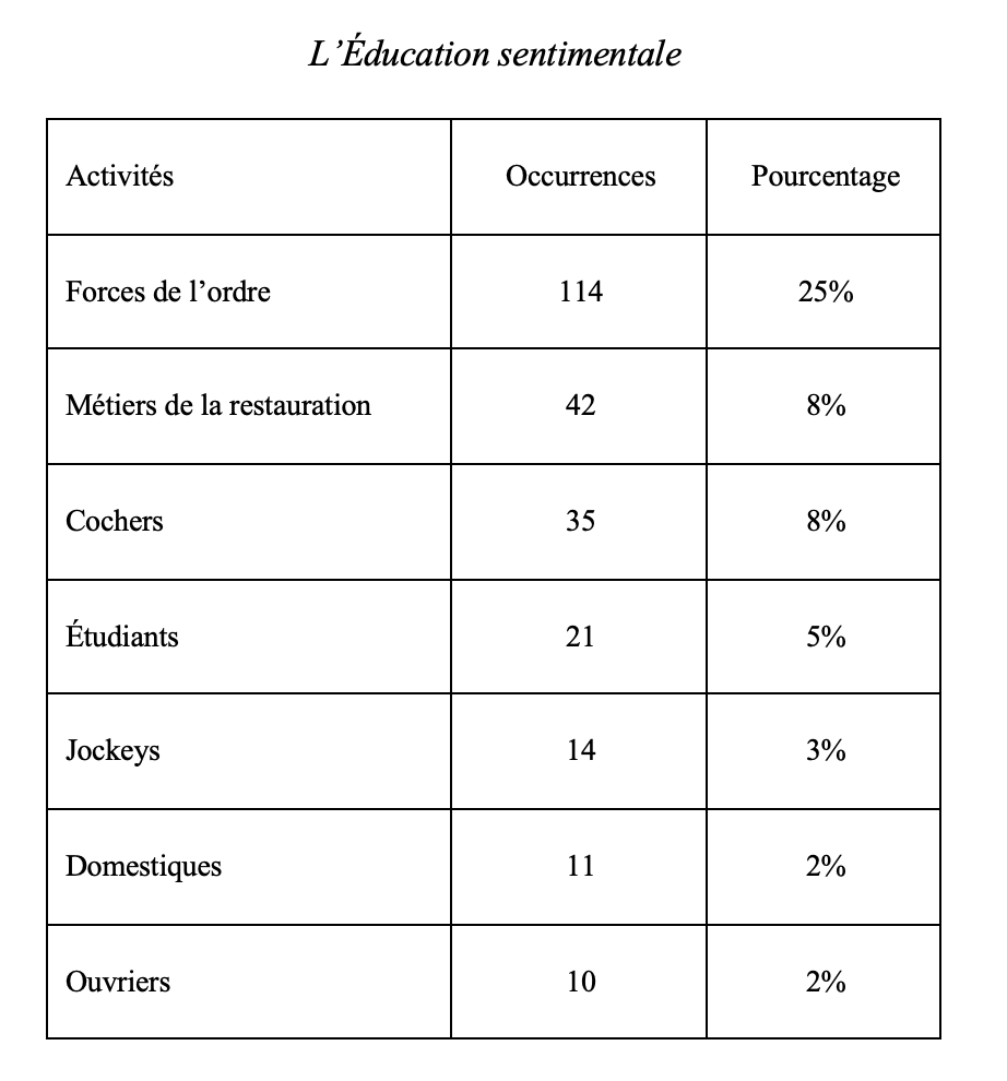 31Pour ce qui est des activités explicitées les plus représentées, on constate des similarités entre les deux romans : les forces de l’ordre (114 occurrences dans L’Éducation sentimentale, 27 dans Paris), les cochers (35 occurrences dans L’Éducation sentimentale, 23 dans Paris) et les métiers de la restauration (42 occurrences dans L’Éducation sentimentale, 16 dans Paris).