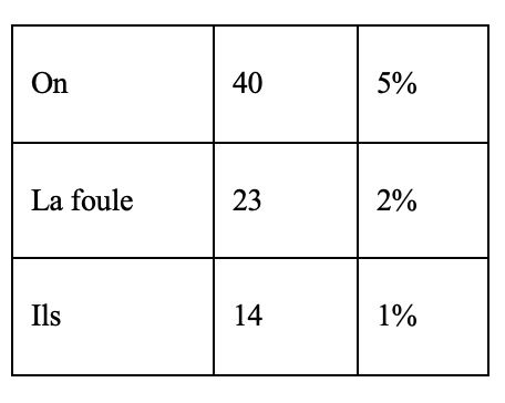 20Les figurants apparaissent de façon majoritaire sous forme plurielle ce qui dit bien qu’il s’agit d’une population fictionnelle collective. Les désignations les plus fréquentes traduisent à la fois cet aspect pluriel, mais également l’aspect abstrait de cette population.