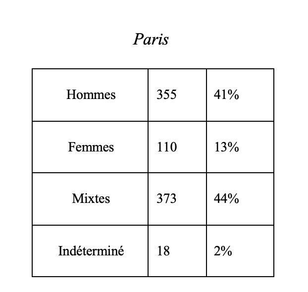 22Dans les deux cas, la faible représentation des femmes s’explique en partie par le primat du masculin dans la langue qui a tendance à effacer la présence féminine, ainsi des nombreux « passants » aperçus dans les rues et dont la désignation au masculin masque la diversité potentielle. La catégorie « mixte » nous permet de les faire réapparaitre partiellement, mais sans pouvoir les voir complètement.