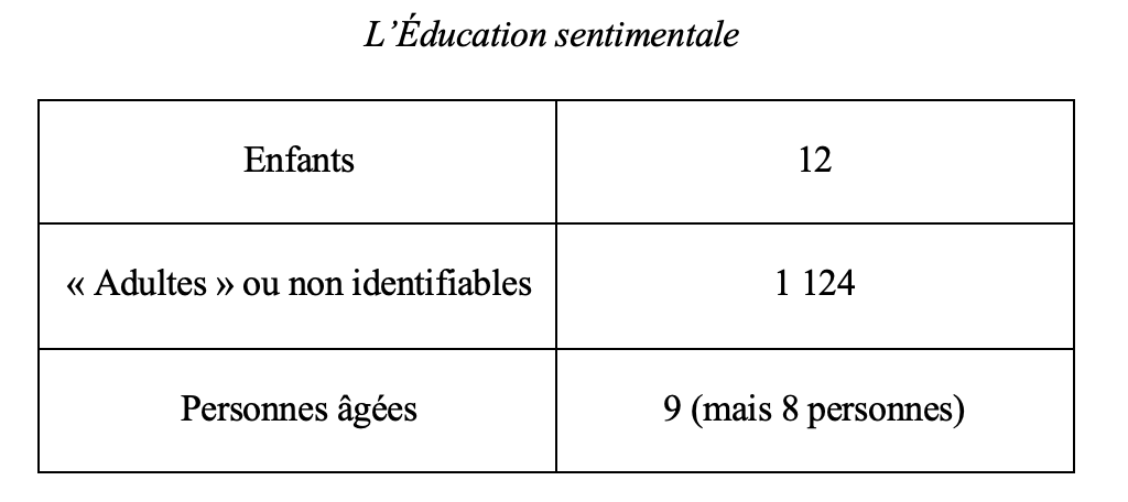 11On constate une plus forte densité de population dans L’Éducation sentimentale avec en tout 20 figurants par 1 000 mots et 7 figurants par 1 000 mots dans l’espace public parisien, que dans Paris avec en tout 13 figurants par 1 000 mots et 4 figurants par 1 000 mots dans l’espace public parisien.