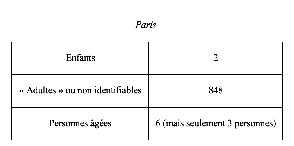 9Que peut-on voir de cette population lorsqu’on la soumet à une approche démographique ? Quelles sont les limites de cette approche lorsqu’elle se confronte à une population romanesque à la caractérisation très limitée ? Nous nous pencherons d’abord sur la composition de cette population dans les espaces publics parisiens, pour ensuite nous interroger sur ce que cette population représente ou nous donne à lire.