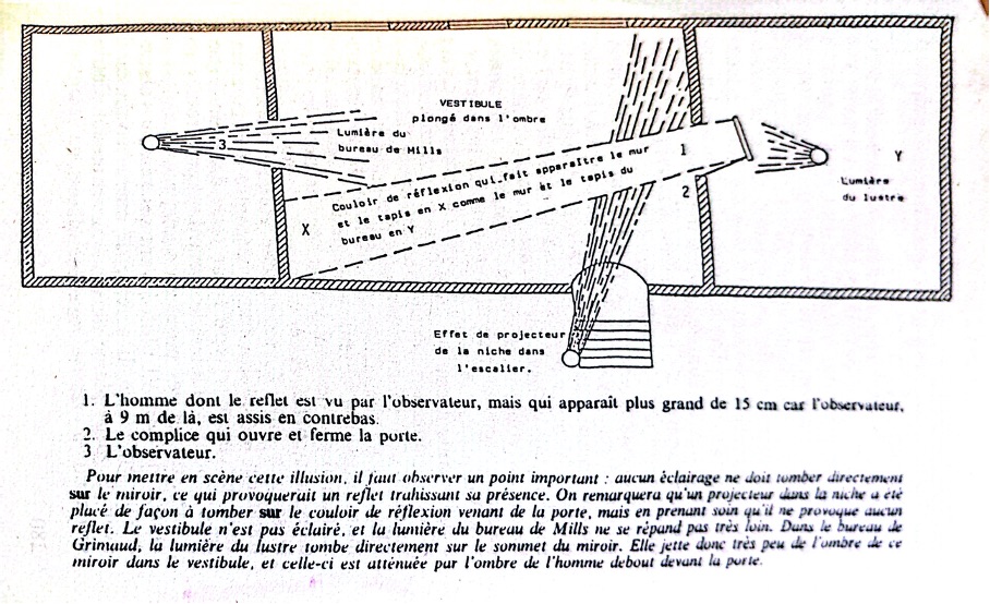 43De fait, le lecteur de chambre close est tiraillé entre deux pôles inconciliables : l’espoir de voir les choses se résoudre naturellement et la déception née de la trivialité de cette résolution. Ainsi, le lecteur, en tout cas celui d’aujourd’hui, ne peut qu’être légèrement déçu19 par les résolutions de Conan Doyle ou Poe, lui qui espère que le meurtrier sera conforme à ce qu’il attend, un humain et non un animal (en cela, la volonté cachée du Dr Roylott derrière le serpent du ruban moucheté apparaît plus satisfaisante que la gratuité du crime de la rue Morgue, même si l’arme du crime, brisant le principe de la clôture de la chambre, ne contente qu’à moitié le lecteur). De même, le lecteur supporte-t-il mal les explications par trop compliquées. Si les plans qui jalonnent Trois cercueils se refermeront lui plaisent tant qu’ils l’aident, le schéma final mettant en lumière le jeu d’illusion qui a été mis en place dans le texte a du mal à obtenir son adhésion, comme on peut le constater20 :