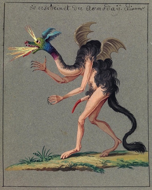 5Auteur d’une botanique inventée, Hugnet a commencé par « linnéiser » pour reprendre le mot de Raymond Queneau dans la préface rédigée pour l’exposition Histoire naturelle et botanique qui se tint à la galerie de l’orfèvrerie Christofle en juillet 1948 (Mahieu, 2010, p. 79) et dans laquelle furent exposées ces fleurs inventées, peintes sur des bouts de nappe et assorties d’une double appellation, savante et vernaculaire12. Les Spumifères sont nés en deux temps, comme l’explique Myrtille Hugnet (Hugnet, 2011, p. 12). La partie graphique – les gouaches réalisées sur des cartes postales érotiques anciennes – date de la même époque que les fleurs peintes, soit la fin des années quarante, tandis que les notices ont été rédigées dans les années soixante. L’édition en volume sous le titre La Vie amoureuse des Spumifères est donc une édition posthume, qui vient accomplir à travers l’objet éditorial (illustration en belle page, assortie d’un cartouche qui rappelle les étiquettes des collections naturalistes et notice descriptive placée en regard) ce qui était resté jusqu’alors à l’état de projet. La composition du livre sous la forme d’un « ouvrage d’histoire naturelle à la Buffon » (p. 13) prolonge en somme l’invention linguistique : les Spumifères, dont Myrtille Hugnet précise qu’ils comptent autant d’espèces que l’Académie de membres, avant d’être les personnages de la satire, sont d’abord le produit des règles qui régissent la taxinomie zoologique. Ils rappellent aussi bien certains ordres parmi les insectes (les coléoptères aux « ailes en fourreau », les lépidoptères aux « ailes d’écaille »), que certains genres parmi eux (les doriphores, « porteurs de lance » ou les sphénophores, « porteurs de carène »). Composé à partir du latin spuma (écume, bave ou mousse) et du suffixe latin -fère (qui porte, qui contient) généralement réservé aux adjectifs – quand le suffixe grec -phoros est réservé aux noms – le Spumifère apparaît d’emblée comme un animal érotique, difficilement identifiable et qui rappelle les créatures hybrides des traités de démonologie du xixe siècle (Figure 1)13 ou la représentation des incubes.