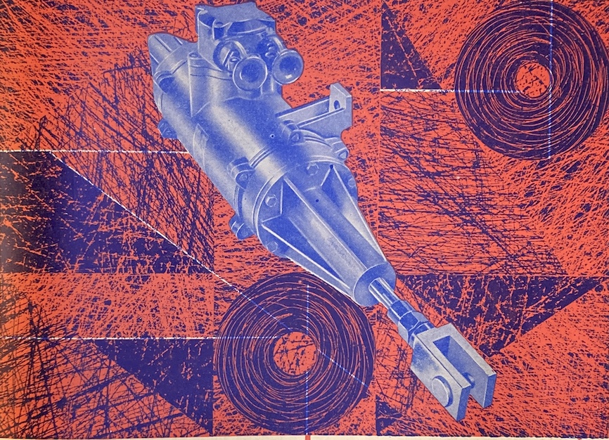 17Même chose avec « l’œuf méca » (no 74) de la mécapoule où l’on voit l’huile des moteurs rejoindre le gras du jaune d’œuf28. Erró profite en outre d’un air de famille entre les deux illustrés, l’usage de caractères à l’encre rouge pour les notions à retenir dans le manuel de sciences naturelles communiquant avec le rouge des encarts publicitaires vantant les machines et l’outillage modernes. Ces encarts constituent à cet égard un véritable répertoire de formes, comme autant de pièces détachées pour la construction des méca-animaux : robinets, siphons, tube cintré dit « ressort jarret », becs verseurs fournissent organes et formes prêts à l’emploi, fraises-mères et accouplements de nouvelles dynamiques de (re)production (Fig. 2), tandis que des machines aux noms (bélier, grue hydraulique d’atelier « giraffe », vanne à papillon, presse à col de cygne) ou aux formes déjà animalisées (compresseurs ou chaudières aux corps massifs, vérins électriques en forme de poisson-torpille offrent pour ainsi dire des méca-animaux ready made. (Fig. 3 et 4)