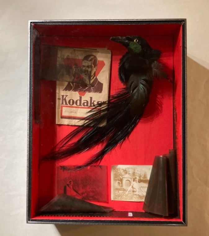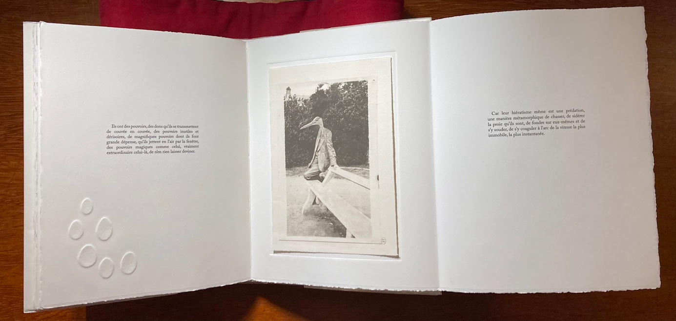 22Laurent Albarracin est éditeur – il dirige les éditions du Cadran ligné et co-animait avec Pierre Vinclair et Guillaume Condello la revue en ligne Catastrophes dont l’aventure s’est achevée avec le numéro 50 (été 2025) – mais aussi poète, se situant lui-même volontiers « dans un certain héritage du surréalisme37 ». La même année il publie Les Oiseaux aux éditions des Deux Corps et, aux éditions Al manar, un bestiaire intitulé Fabulaux, contraction de fabuleux, fabliau et animaux. Maëlle de Coux est photographe plasticienne et a réalisé de nombreux projets consacrés aux corps animaux, le Muséum d’Histoire naturelle constituant tout à la fois dans l’œuvre de l’artiste une source d’inspiration, un matériau photographique et un lieu d’exposition. « Des bêtes » présenté en 2006 et 2007 aux Muséum de Nantes et de Bourges, mais aussi « Des bêtes et des mots » exposé à Nancy en 2012 sont ainsi composés d’une série de photographies d’animaux naturalisés, retravaillés selon une technique qui rappelle la photopeinture38, art de l’hybridation par excellence (Treille, 1990) ; tandis que les collections d’œufs, « promesses de vie [dont] reste la fragile coquille » forment la matière de deux expositions, « Muséums » (2012, Vannes) et « Œufs » (2013, Nantes)39. C’est de la série intitulée « Les hommes-oiseaux » que sont tirés les huit photomontages qui accompagnent le texte de Laurent Albarracin, une série réalisée entre 2009 et 2014 et qui comporte au total 62 photomontages imprimés à l’encre sur papiers orientaux40. Si les photomontages étaient originellement accompagnés d’un titre – « femmouette », « stern’hommes », « cormorhomme », « corbhomme », le plus souvent composés sur le principe du mot-valise – ces noms d’espèces disparaissent dans le recueil publié aux Éditions des Deux corps. Quoique l’artiste se prête rarement au jeu des généalogies et des filiations, sinon de manière allusive – elle se contente par exemple d’évoquer l’oiseau comme le « symbole […] de la liberté poétique surréaliste41 » – il est difficile devant les « hommes-oiseaux » de Maëlle de Coux de ne pas se souvenir des collages de Max Ernst dans Une semaine de bonté (1934), dont la plupart des personnages masculins sont des hommes-oiseaux. De même, le jeu avec les photographies anciennes et le rapport à l’objet trouvé font-ils signe vers les formes surréalistes. Maëlle de Coux utilise en effet pour créer ses hommes-oiseaux des photos de famille anciennes, auxquelles elle associe des photographies argentiques d’oiseaux naturalisés, saisis dans les réserves des muséums – oiseaux auxquels elle semble ainsi redonner vie. Le tirage de tête réalisé par les Éditions des Deux Corps est d’ailleurs assorti d’un emboîtage particulièrement travaillé mêlant un oiseau naturalisé, une ancienne réclame pour Kodak et une série de négatifs, qui peuvent rappeler les boîtes de Joseph Cornell ou les poèmes-objets de Breton42 (Fig. 5).
