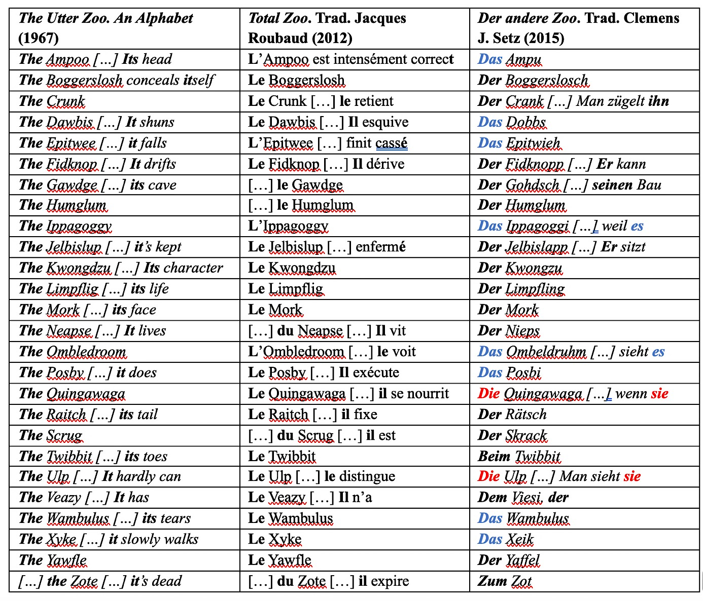 23Le genre grammatical est, on le sait, indissociable d’un enjeu de classification suivant un ensemble clos de catégories (féminin/masculin, animé/inanimé, humain/non-humain, etc.), à laquelle se surimpose une adaptation supposée au sexe des référés qui repose sur le principe de binarité sexuée (mâle/femelle). Même en anglais, où le genre grammatical est globalement absent, il est donc supposé que le sexe des animaux, en particulier d’une majorité des oiseaux et mammifères (insectes ou amibes sont exclus), reste inférable des mots pris en contexte, là où de manière explicite et automatique, en français ou en allemand, le féminin implique généralement femelle et le masculin mâle, selon un principe de concordance et de continuité logique. Les langues proposent de fait des systèmes variés pour articuler sexe biologique d’une bête et son identification dans le langage, selon des modèles linguistiques comme scientifiques souples23. Se pose néanmoins la question de savoir ce qui a présidé aux choix du traducteur allemand de varier les genres et d’assigner tel pronom à telle créature. En fonction d’« affinités » supposées ou fantasmées ? Au hasard ? En projetant des conceptions sur les bêtes, suivant leur apparence et leur comportement ? Cette distribution différentielle n’en change pas moins la manière de percevoir ces créatures, en particulier dans le cas du genre « marqué » (Wittig, 2001), avec seulement deux bêtes genrées au féminin, dont l’une est très inquiétante et décidément féroce24, l’autre totalement invisible25, en une représentation polarisée et stéréotypée du féminin. Difficile de ne pas y lire un dispositif qui traduit des représentations genrées dominantes dans l’imaginaire collectif suivant le paradigme asymétrique préjudiciable au féminin et le principe de « valence différentielle » (Héritier, 2012, p. 17). Cette singularité de la version allemande conduit à poser explicitement la question du genre, grammatical comme biologique, impensée dans l’original et la traduction française.