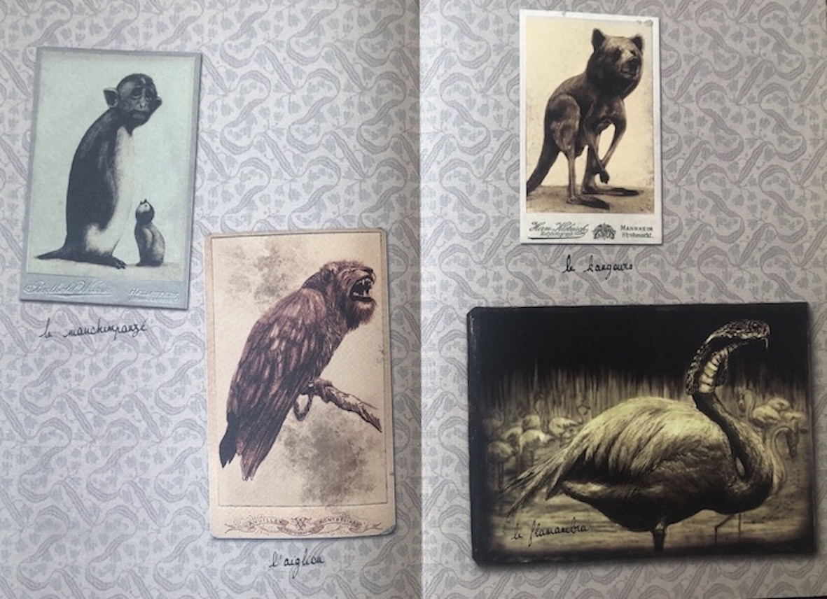 29Dedieu, évoquant la genèse de cet ouvrage (Dedieu, 2015a), rapporte une scène originelle, saugrenue, dont on ne sait si elle est réelle ou inventée, d’une girafe qui se promenait dans les rues de New-York – bien avant le covid qui nous a familiarisés avec ce type de scène. Dans un entretien (Dedieu, 2015b), il évoque également les modalités de création, notamment le pêle-mêle et les différentes techniques dont il a pu s’inspirer pour engendrer des nouvelles créatures. Il y affirme sa volonté de déstabiliser le lecteur, de lui faire croire au mensonge de ce qui est, là encore, une forme de canular bien ficelé, mais non dénué de sens. Une déstabilisation que l’illustrateur quelques années auparavant visait aussi dans l’album Zoo (2009), où la visite du zoo ne montrait aucun animal, mais seulement des spectateurs qui avaient l’allure des animaux qu’ils étaient venus voir. L’Étrange Zoo de Lavardens, usant d’un style et d’une forme très différents, est bien une autre entreprise de déstabilisation, efficace, où le lecteur est d’abord pris au piège du spectaculaire, à l’instar des visiteurs de la fiction, avant de s’interroger sur la folie toute humaine qui est à son origine.