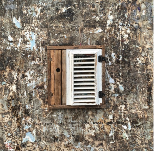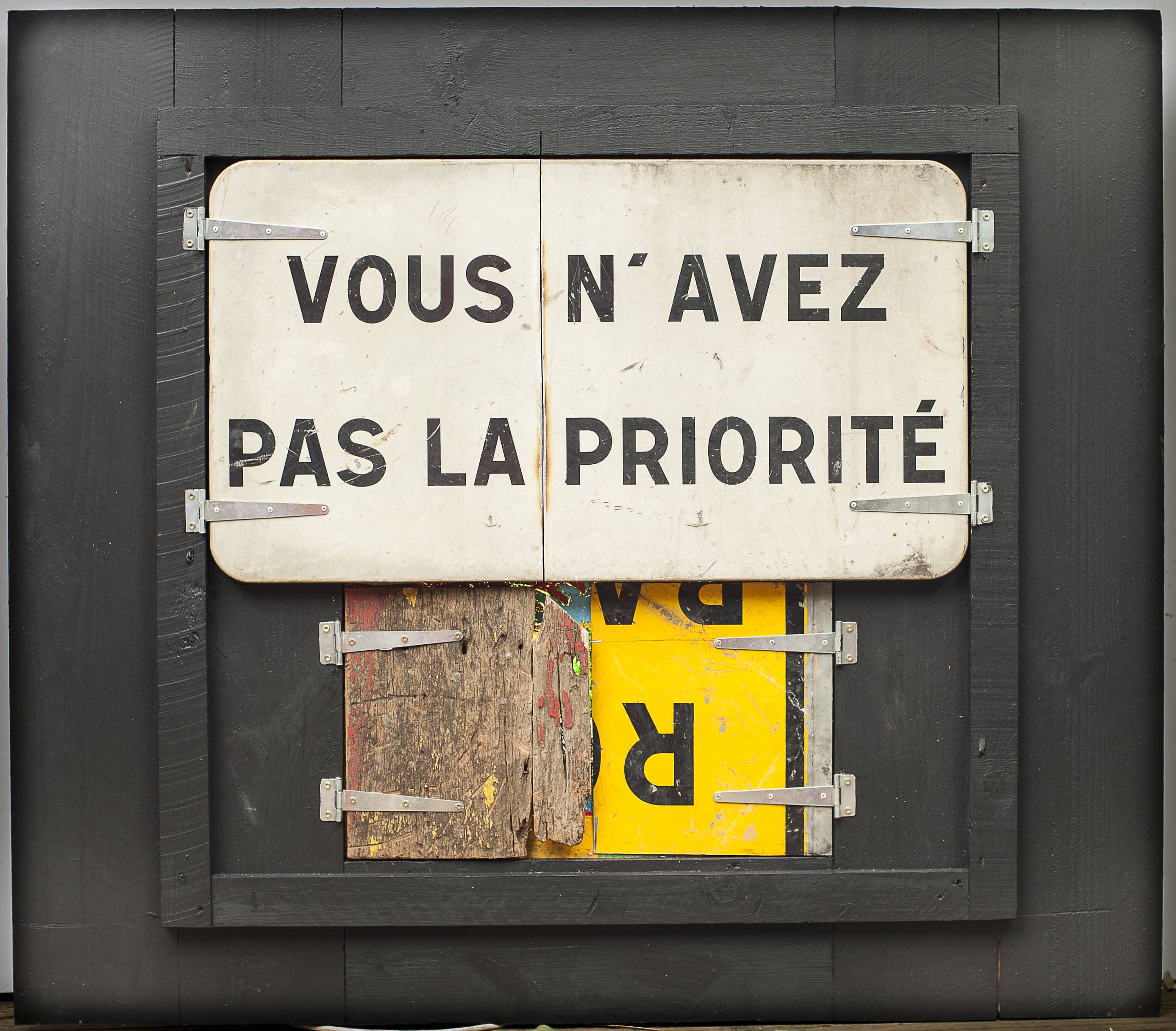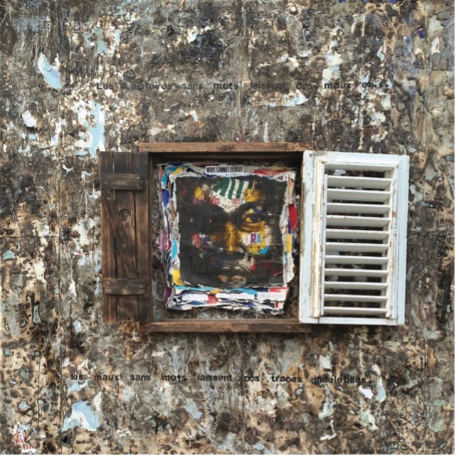 47Mert représente de multiples fenêtres-volets, d’abord fermés et que seule notre action peut ouvrir. Ne nous invite-t-il pas à regarder ainsi vers l’intérieur de notre histoire, de notre passé pour mieux ce faisant regarder vers l’avenir ? Par l’utilisation d’une technique d’empilement de couches d’affiches, supports de la consommation mondialisée, récupérées au bord des routes, chemins, traces, Mert nous propose une tras-versée de plusieurs types, dans la matière, le temps et l’espace, en tous les cas une tras-versée du « Je » jusqu’au « NOU », en passant par la nécessaire récupération d’une histoire écrite par d’autres ou lacunaire. D’où son cri, son « stop » dés-extractivé : « Je veux écrire mon histoire au tableau », « Pour une union autrement » et en finir avec les « Vous n’avez pas la priorité » (2018) d’un volet blanc – surligné d’une croix rouge qui redouble l’idée de fermeture – monté sur un cadre peint, symboliquement, en noir ébène :