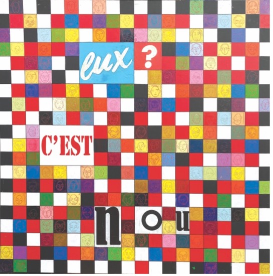 17Mert (re)compose des visages, toujours avec le même message de valorisation du NOU, de l’unité et non de l’individualisme, qui peut même se voir développé comme dans Évitez… (2018) où l’on peut lire : « Attention / Pour mieux / protéger / la qualité /de an nou / il faut / évitez trop / de votre MOI ». Le jeu sur les couleurs, réunies et séparées à la fois dans des formes géométriques qui forment une mosaïque aléatoire, relie le fond aux couleurs vives à des éléments constitués des mêmes couleurs et formes présentes sur le visage féminin en une exemplarisation de la multiplicité hétérogène de chacun, ciment de ressemblance dans le NOU. En somme, c’est le Tout-monde à l’œuvre comme semble le rappeler la photographie de Glissant insérée dans cette mise en abîme de visages dans un visage, comme un clin d’œil à la pensée du Divers de cet auteur et philosophe martiniquais. Notons également l’insertion (outre la figure de la mulâtresse Solitude) d’une photographie en couleur de Fidel Castro, en rappel d’une conscience de l’impact de la revisitation cubaine du marxisme.