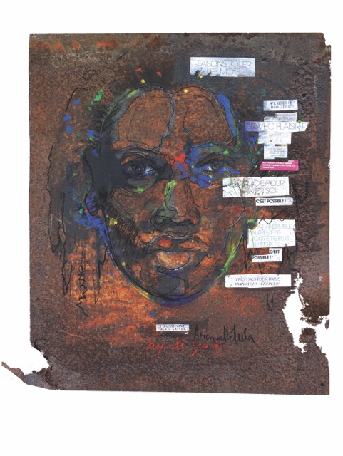 30Le message mertien rejoint ainsi celui des auteurs caribéens cités plus avant et qui ont nourri et continuent de nourrir la culture antillaise franco-créolophone. L’idéologie marxiste n’est toutefois pas prévalente chez Mert. Il n’empêche que l’on retrouve des éléments communs, et notamment le même message de fraternité, plus exactement d’humanité réunie, qu’il affiche par exemple dans Tras déversées, et toi ? (2020). Dans cette œuvre, à partir d’un support d’affiches lacérées, en des échos de résiliente face scarifiée par le temps et les marques du passé, les éléments de collage sont autant de coupures/déchirures de journaux qui mettent en valeur : « L’Humanité » à l’encre rouge, placée au centre, sur le nez donc, d’une face au phénotype négroïde. Comme pour renforcer ce choix et confirmer son apport d’équilibre, on retrouve sur les deux joues (en rappel des deux mains du proverbe créole précité) de ce visage les expressions – jeux de mots et de sons – réalisées en collage également : « Faites de l’humanité » et « la fête de l’Humanité ». De la même façon, « solidarité » fait écho à « fraternité ». Si on privilégie une lecture verticale, dans ce choix de construction rhizomique où la lecture peut se faire dans des ordres divers, on lit alors sur le front de cette face afrodescendante la profession de foi de Mert : « J’ai choisi de ressourcer le monde tous ensemble… ».