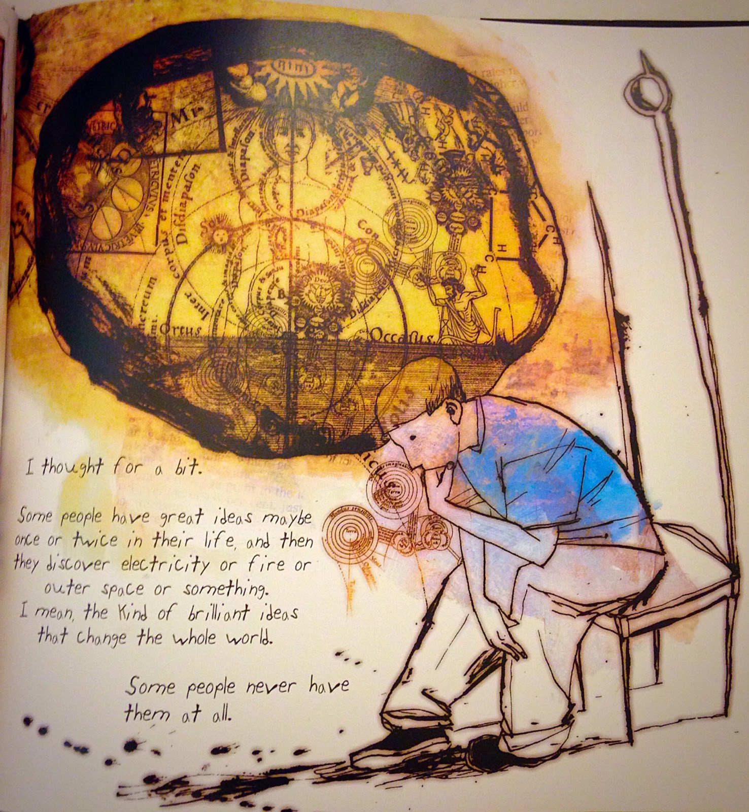 8Les mélanges de styles ou de formes d’art visuel de McKean peuvent aussi parfois se mettre au service d’un ton plus léger, notamment dans deux livres illustrés pour enfants réalisés avec Gaiman. Dans le premier, The Day I Swapped my Dad for Two Goldfish (2001), le narrateur est un enfant qui a donné son père (sorte d’homme-meuble constamment assis à lire le journal) à un ami, en échange d’un bocal contenant deux poissons rouges. Quand sa mère rentre, elle se met en colère et l’enfant doit aller refaire l’échange. Malheureusement, l’ami a déjà échangé le père contre une guitare électrique. Le jeune narrateur est donc obligé de suivre à rebours un parcours d’échanges entre divers enfants pour retrouver son père. La majeure partie des illustrations se compose de simples dessins, très stylisés, imitant un style enfantin adapté au ton du livre. Le texte suit d’ailleurs la même rhétorique d’extrême simplification de la forme pour évoquer le parler enfantin. On trouve cependant encore, çà et là, des formes visuelles différentes mêlées aux dessins, les plus notables étant de vraies colonnes de journal reproduites dans le cadre dessiné du journal du père20, ou encore le bocal des poissons rouges, qui apparaît, comme les marionnettes dans Mr Punch, systématiquement sous forme de photographie21. Ce dernier procédé transpose, dans l’univers à deux dimensions des illustrations, la perception déformée que l’on a en général des poissons dans un bocal, du fait de l’effet grossissant des parois de verre. La situation est burlesque, digne d’un imaginaire de cartoon, et pousse le goût de l’absurde jusqu’à faire apparaître, le temps d’une page, de manière gratuite et sans incidence sur le reste du livre, une reine de Mélanésie coiffée d’une imposante caravelle, qui vient justepour applaudir au retour d’un lapin échangé dans la famille d’un des enfants22. On voit là une autre facette de l’écriture de Gaiman, le fait qu’il soit un disciple avoué des Monty Python, de P.G. Wodehouse, et de toute la tradition d’humour anglais souvent désignée par le nom anglais « nonsense ». Les jeux graphiques de McKean peuvent aisément s’adapter à un tel ton comique raffiné, comme le montre le passage où l’on voit le jeune narrateur en train de réfléchir. Sa réflexion est symbolisée par un phylactère contenant des reproductions de cartographies de cosmogonie héliocentrique, comme il s’en faisait au Moyen-Age et encore jusqu’à la Renaissance23. Ces schémas évoquent une période de l’histoire des idées, une entreprise sérieuse, philosophique, visant à comprendre l’univers, mais ils sont pourtant utilisés, comme des dessins naïfs d’engrenages dans certaines bandes dessinées pour enfants, pour symboliser de manière comique l’intense réflexion d’un personnage au sein d’une bulle.