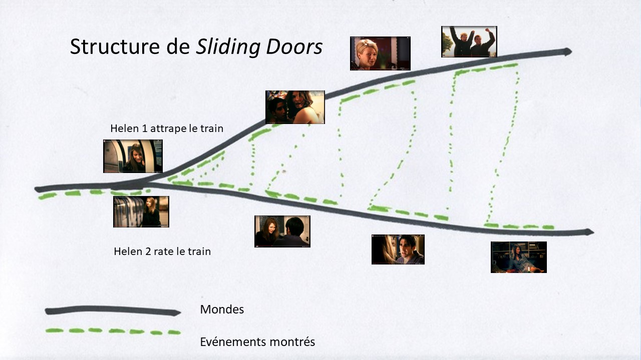 12Sliding Doors est une comédie romantique basée sur l’idée selon laquelle des événements apparemment minimes peuvent avoir des conséquences majeures. C’est une idée fondamentale de la théorie de la complexité, connue comme « l’effet papillon » : un papillon qui bat de l’aile au Chili peut causer un cyclone en Chine. Mais le film traite cette idée comme allant de soi et ne propose aucune explication scientifique. Pour développer complètement les conséquences de l’événement minime, le film se limite à deux branches : l’une où l’héroïne, Helen (jouée par Gwyneth Paltrow), qui vient d’être licenciée par son patron, parvient à attraper le métro pour rentrer chez elle, et l’autre où elle manque le train de justesse et doit prendre le suivant. Les deux branches ne sont pas le produit d’importantes décisions de l’héroïne mais le résultat d’un pur hasard, une version d’Helen mettant quelques secondes de plus que l’autre à atteindre le quai du métro. Mais ces quelques secondes ont des conséquences majeures. Dans la première branche, en arrivant chez elle, Helen (appelons-la Helen 1) découvre son partenaire, Gerry, au lit avec une maîtresse. Dans la deuxième branche, Helen 2 arrive juste après le départ de Lydia, la maîtresse, et bien que l’appartement présente de nombreux signes de la visite (lit défait, deux verres de vin), le partenaire, Gerry, arrive à persuader Helen 2 que rien ne s’est passé. Dans la première branche, Helen 1 jette son alliance dans une rivière, se réfugie chez une amie, trouve un nouvel amour en la personne d’un certain James qu’elle a rencontré dans le métro, et fonde une compagnie qui prospère. Dans la deuxième branche, Helen n’a pas de preuve de l’infidélité de Gerry, bien qu’elle ait des soupçons. Comme c’est elle qui gagne sa vie pour soutenir Gerry pendant qu’il prétend écrire un roman, elle doit prendre des jobs mal payés comme serveuse de restaurant pour permettre au ménage de subsister. En d’autres termes, Helen 1 est libérée de Gerry et Helen 2 reste opprimée. À la fin du film, les deux Helen ont chacune un accident et sont transportées à l’hôpital. Helen 1 meurt dans les bras de James, alors qu’Helen 2, qui n’est que légèrement blessée, rompt avec Gerry et sort seule de l’hôpital. Dans l’ascenseur, elle rencontre James, et le film suggère qu’ils vont tomber amoureux l’un de l’autre, tout comme Helen et James dans le premier monde.