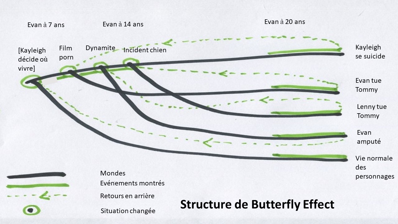 (5) : Le film présente une structure arborescente, puisque les mondes divergent en fonction des situations qu’Evan revisite pour éviter des drames.