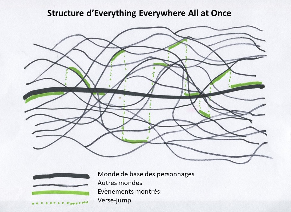 25Si Sliding Doors a deux mondes et Butterfly Effect une demi-douzaine, mon troisième exemple, Everything Everywhere All At Once (EEAAO), en a, au moins théoriquement, une infinité, conformément à l’interprétation du multivers par la physique quantique. Il est évidemment impossible pour un film de représenter l’infini, mais on peut le suggérer par de multiples prises de vue de mondes différents qui se succèdent très rapidement. Le nombre supposé infini de mondes rend le film très difficile à résumer, cela d’autant plus que les résumés respectent la logique linéaire de la causalité, alors que EEAAO me semble plus redevable de la logique des rêves qui fait subir d’incessantes transformations à des objets fluides.
