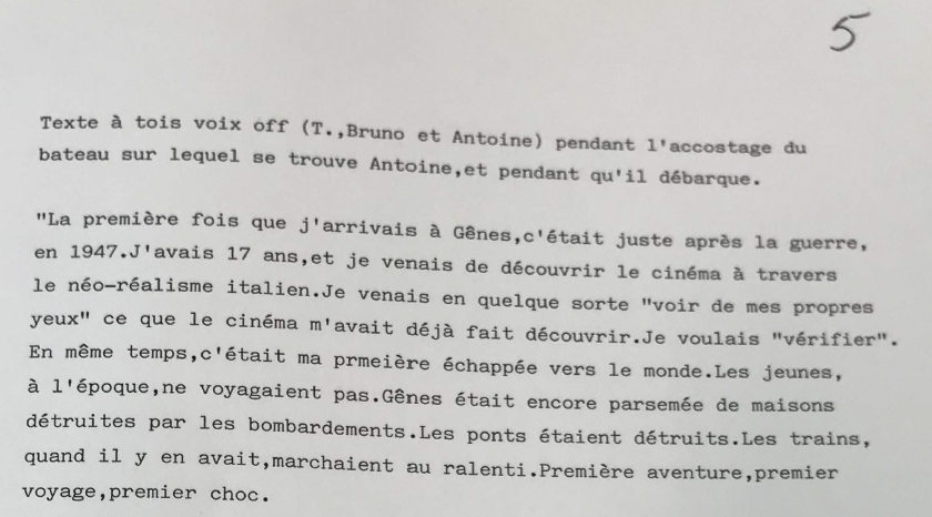 « Quand il s’approche du quai, Antoine aperçoit Cécile toute petite sur le quai et lui adresse un signe. Puis il disparaît à l’intérieur du bateau pour remplir les formalités de débarquement. Cécile se retrouve à nouveau seule sur le quai, impatiente, agacée par la lenteur des choses. C’est à ce moment là que s’élève la voix de T : La première fois que j’arrivais à Gênes […] » (8‑9 [4])