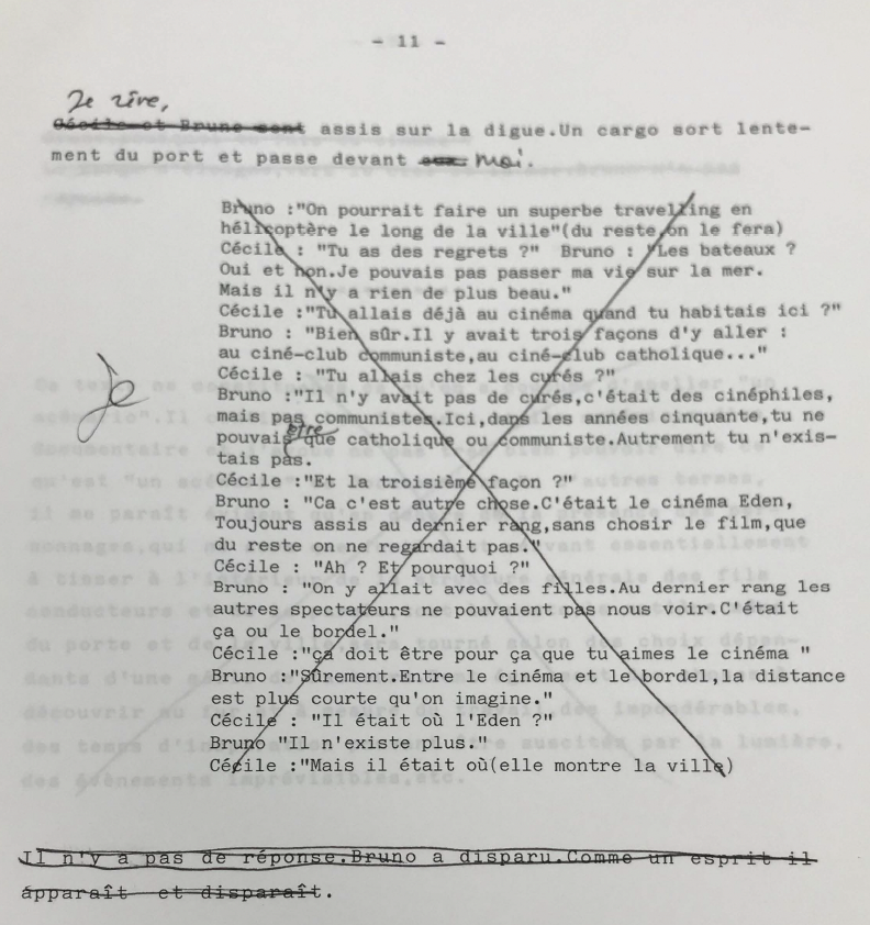 6C’est ce troisième point, qui d’une certaine manière subsume les deux autres, que nous proposons d’éclairer au prisme des documents de genèse, en étant conscient que la continuité génétique du film est en quelque sorte rompue puisque, conformément au projet de série initial, les documents d’archives présentent plusieurs variantes de séquences (auto)fictionnelles, totalement abandonnées en cours de route. La genèse du film dévoile donc un véritable changement de paradigme générique, le projet initial relevant peut-être d’une modalité inédite – hybride puisqu’une partie du projet est tout de même réalisé et visible – de la taxinomie des films sans images établie par Jean-Louis Jeannelle (2015, p. 125‑142).