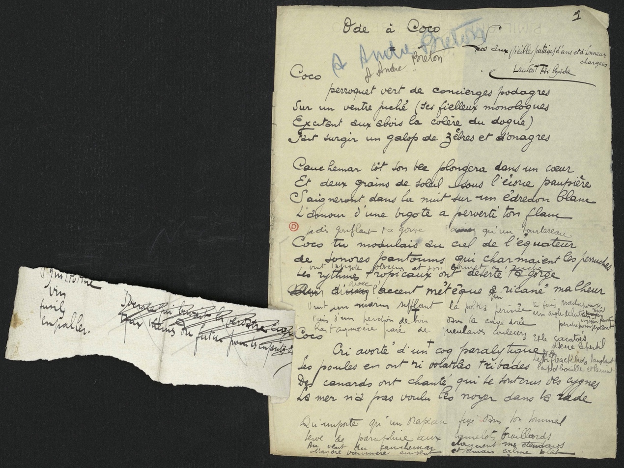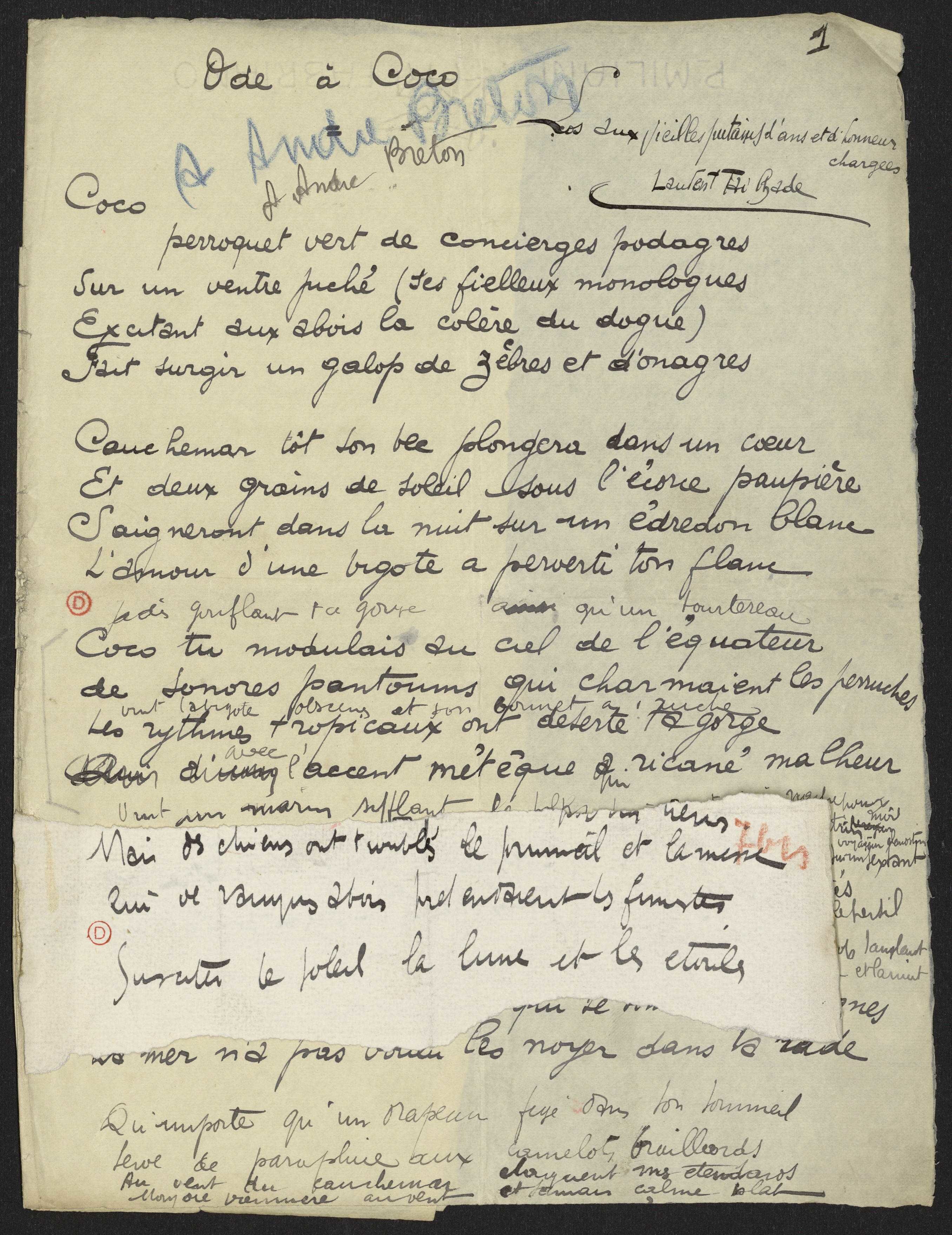 4Le manuscrit de « L’Ode à Coco », conservé à la Bibliothèque littéraire Jacques Doucet et aujourd’hui disponible dans la bibliothèque numérique des manuscrits ALMé, appartenant à André Breton, est entré dans les collections de la bibliothèque lors de la vente André Breton de 200310. Ce manuscrit est constitué par six feuillets in-4° foliotés de 1 à 6 sur papier crème écrits au recto à l’encre noire et insérés dans une chemise rouge titrée sur une étiquette blanche « Robert Desnos/Le Fard des Argonautes/Ode à la Coco/L’Aumonyme etc… ». La dernière page est signée « Desnos » et datée 1919. Il s’agit d’un document exceptionnel puisqu’il nous permet d’entrer dans l’atelier poétique de Robert Desnos et de suivre les étapes de création du poème, de cette arborescence vers une forme définitive. Le manuscrit présente en effet de nombreuses corrections et ratures mais révèle surtout une version initiale à laquelle Desnos a vraisemblablement ajouté des séquences de vers et des strophes, dans un moment, ou dans des moments successifs. Cette constatation est plutôt évidente par l’adjonction aux feuillets 1, 2 et 4 de lambeaux de papiers manuscrits, des paperoles, qui brisent la succession linéaire de la rédaction originaire du poème. Ces paperoles ne remplacent pas des vers : collées à gauche des feuillets pour permettre de les tourner et laisser lire ce qui est au-dessous, elles comportent des strophes ajoutées en complément de celles déjà écrites.
