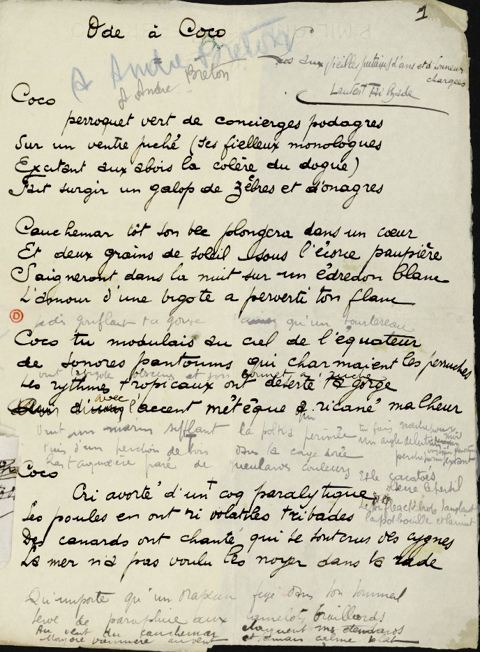 7Si l’on extrait le texte qui apparaît en filigrane du manuscrit appartenant à Breton, le poème avant les interventions successives, on découvre un poème de vingt-six strophes au lieu des trente-deux dans la version publiée. La partie la plus modifiée se situe dans la première moitié de ce long poème, partie qui se termine après le passage en revue de la polysémie du terme « coco » avec l’occurrence de ce mot dans sa dernière signification, celle, populaire, de cocaïne21. Dans ce segment-là, les vers ajoutés sont au nombre de trente-et-un sur un total de quarante. Cette version primitive insistait davantage sur la répétition anaphorique qui marque certains vers. On avait en effet au début des huit premières strophes — composées de quatrains d’alexandrins — l’anaphore sur « coco » en série, exception faite de la deuxième strophe qui commence par « cauchemar » mais conserve la répétition des phonèmes /ko/ : « Coco perroquet vert de concierges podagres », « Cauchemar », « Coco tu modulais au ciel », « Coco cri avorté d’un coq paralytique » (« coco » pour le cri « cocorico »), « Coco femme de Loth » (« coco » pour « cocotte », femme légère), « Coco fruit défendu des arbres de l’Afrique », « Coco petit garçon » et « Coco la catin pâle aux fards décomposés / a reniflé ce soir ». L’insertion de nouveaux vers interrompt et atténue ce rythme de martèlement.