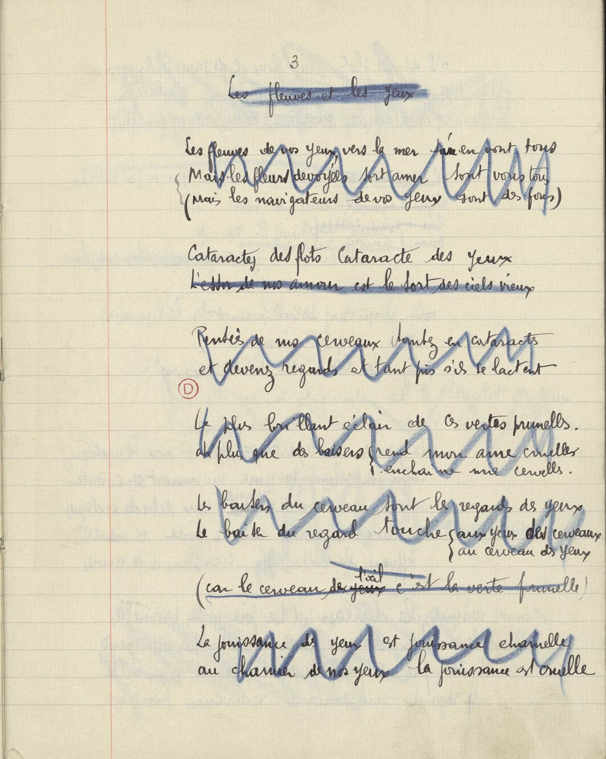 21Du thème du fleuve et des yeux, présent dans le titre initial, découle toute une série d’images et de réverbérations sonores, dont le vers « cataracte des flots cataracte des yeux » qui profite du double signifié du mot cataracte : la chute d’eau sur le cours d’un fleuve et la maladie qui provoque une cécité partielle ou totale. Un accouplement réussi d’où surgissent des rapprochements antithétiques : à la perte de la vue s’oppose le bruit de la cascade, au cristallin de l’eau, le cristallin opacifié des yeux. Obstruction et ouverture, clarté et obscurité, se réunissent. C’est ce vers qui, noyé d’abord dans la suite des analogies, est choisi comme vers liminaire du poème amputé de son titre originaire. En effet, bien que la progression du poème jusqu’aux strophes finales soit axée sur les thèmes du fleuve, de l’eau, et des yeux, dans l’hypotexte prolifèrent les répétitions de calembours sur la permutation de sons — comme dans Rrose Sélavy — et les jeux d’homonymes qui semblent, d’un côté, provoquer une certaine circularité empêchant les signifiés de progresser, de l’autre ouvrir le sens vers des directions potentiellement infinies. Voici quelques vers biffés au crayon bleu dans le manuscrit et abandonnés dans la version publiée du poème :