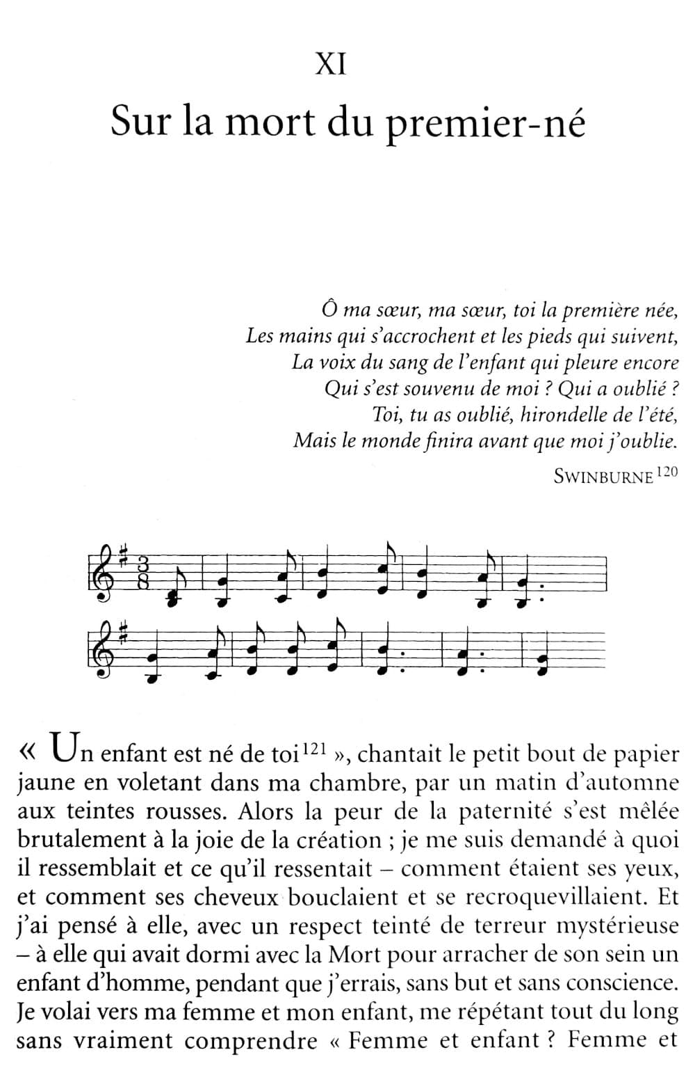 Ces neuf petits grains de beauté […] : ils étaient des notes de musique ! Il s’agissait des neuf petites notes de musique de M, entre croches et noires et rondes, tatouées directement sur la portée de son bras […]. Notes que, bien évidemment, religieusement, j’ai retranscrites sur une vraie portée […]. Avant d’enregistrer toute la séquence sur un piano et, en boucle, me la passer et l’entendre s’élever jusqu’au ciel. Me bercer jusqu’à l’ivresse du « thème de M » […].