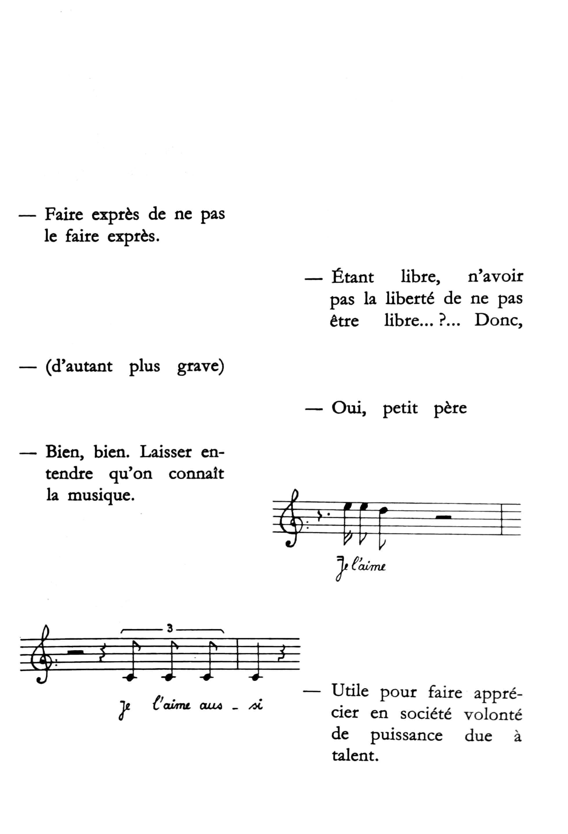 36Le roman de Kundera est ainsi emblématique du mouvement que l’on observe dans les textes porteurs de partitions : si la partition renvoie ponctuellement à une mélodie, à un motif, ou sert à reproduire plus simplement que ne le ferait une description la sensation d’une parole prononcée, d’un son entendu, elle fait aussi très souvent signe vers une conception musicale du récit, du poème ou du texte. La partition ou la notation musicale joue toujours avec le lecteur, qui n’est jamais totalement exclu. Même dans le cas où une partition serait indéchiffrable, cette illisibilité resterait un effet de lecture qui refléterait un lien au logos, une pensée de la société, une certaine conception de la langue littéraire. En apparence neutre et objective puisqu’inscrite dans un système de notation normé et codifié, mais invitant à créer un son intérieur, un imaginaire sonore, ou, parfois, en lieu et place du son, un imaginaire pictural ou graphique, la partition crée un jeu permanent entre l’intérieur et l’extérieur, entre les différents langages artistiques.