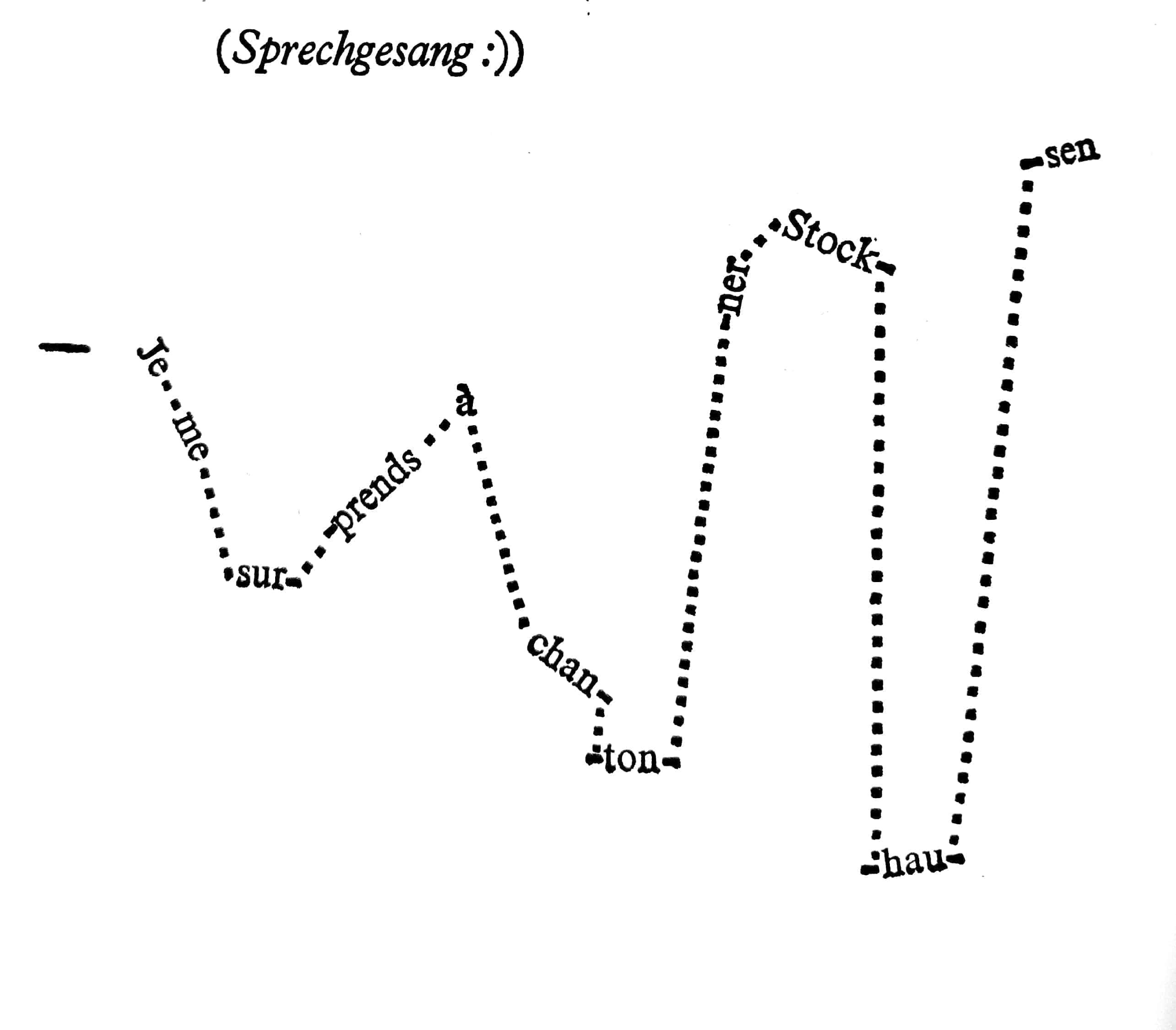 32La partition peut également rendre compte de la prononciation ou de l’intonation d’une phrase, d’une onomatopée, d’un son. Elle imite le mouvement intonatif du discours plus efficacement que ne le feraient les mots. Ce phénomène se retrouve chez Maurice Roche, quand quelques mesures sur une portée standardisée reproduisent le schéma intonatif de phrases courtes, ou quand, en référence au Sprechgesang (chant parlé ou déclamé) et à Stockhausen, les portées disparaissent au profit d’un simple tracé indiquant des hauteurs (fig. 13-15).