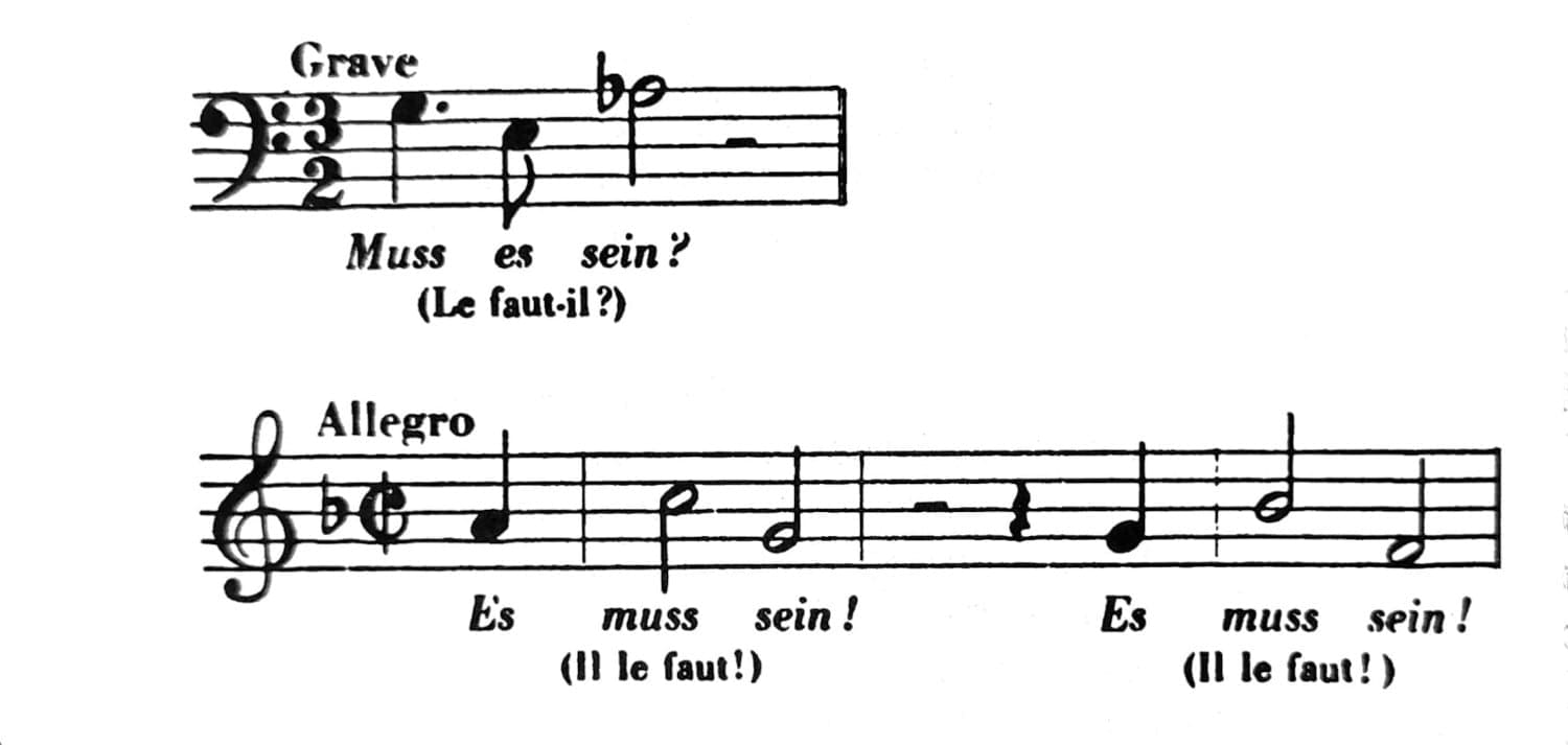 Tomas haussa les épaules et dit : « Es muss sein. Es muss sein. » C’était une allusion. Le dernier mouvement du dernier quatuor de Beethoven est composé sur ces deux motifs [fig. 16] :